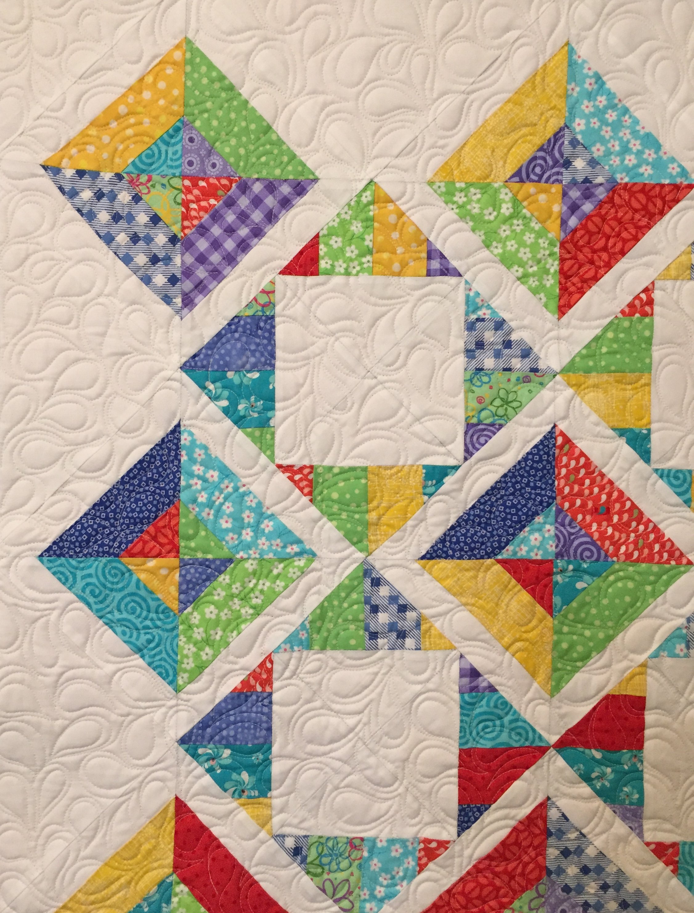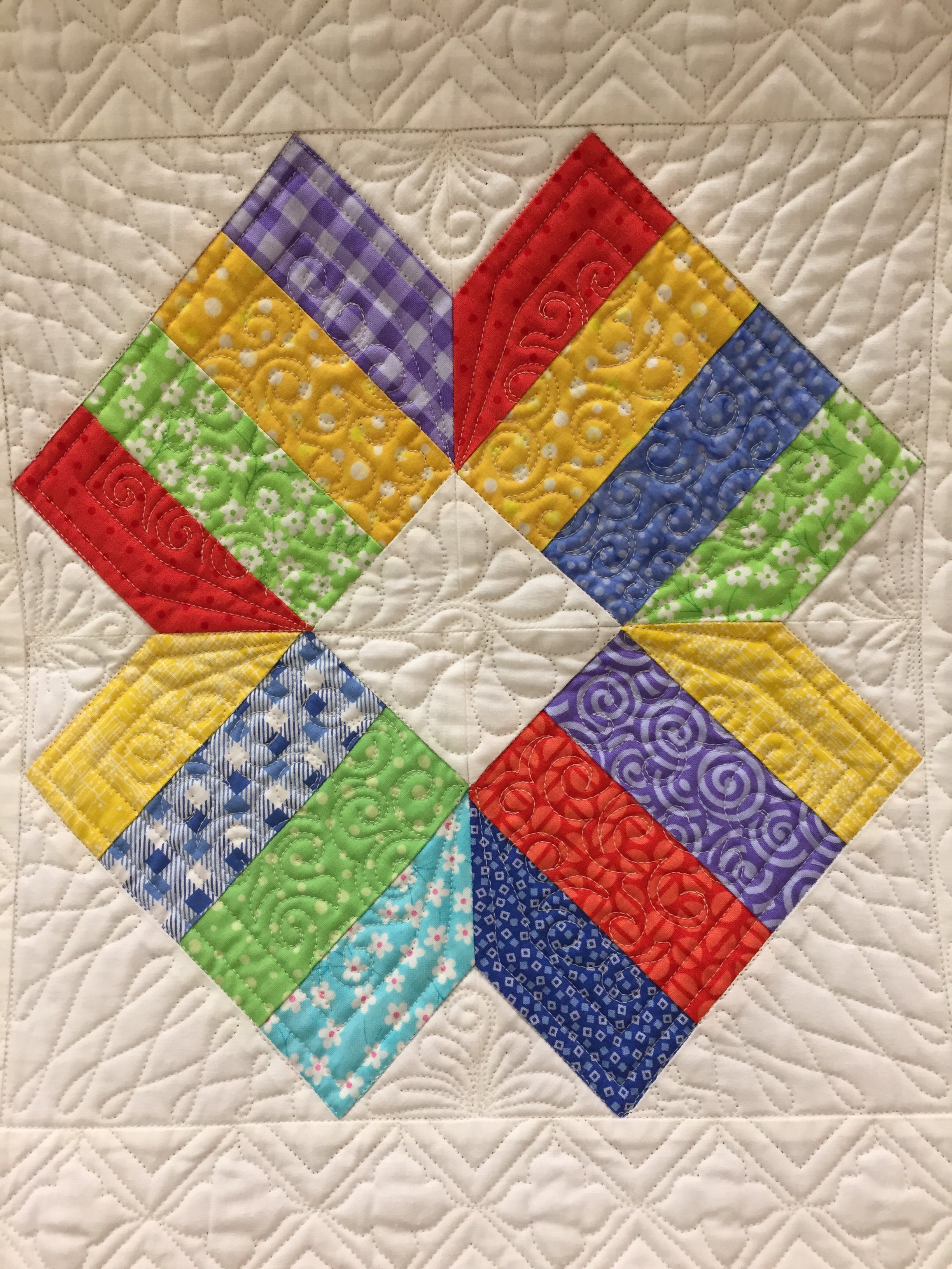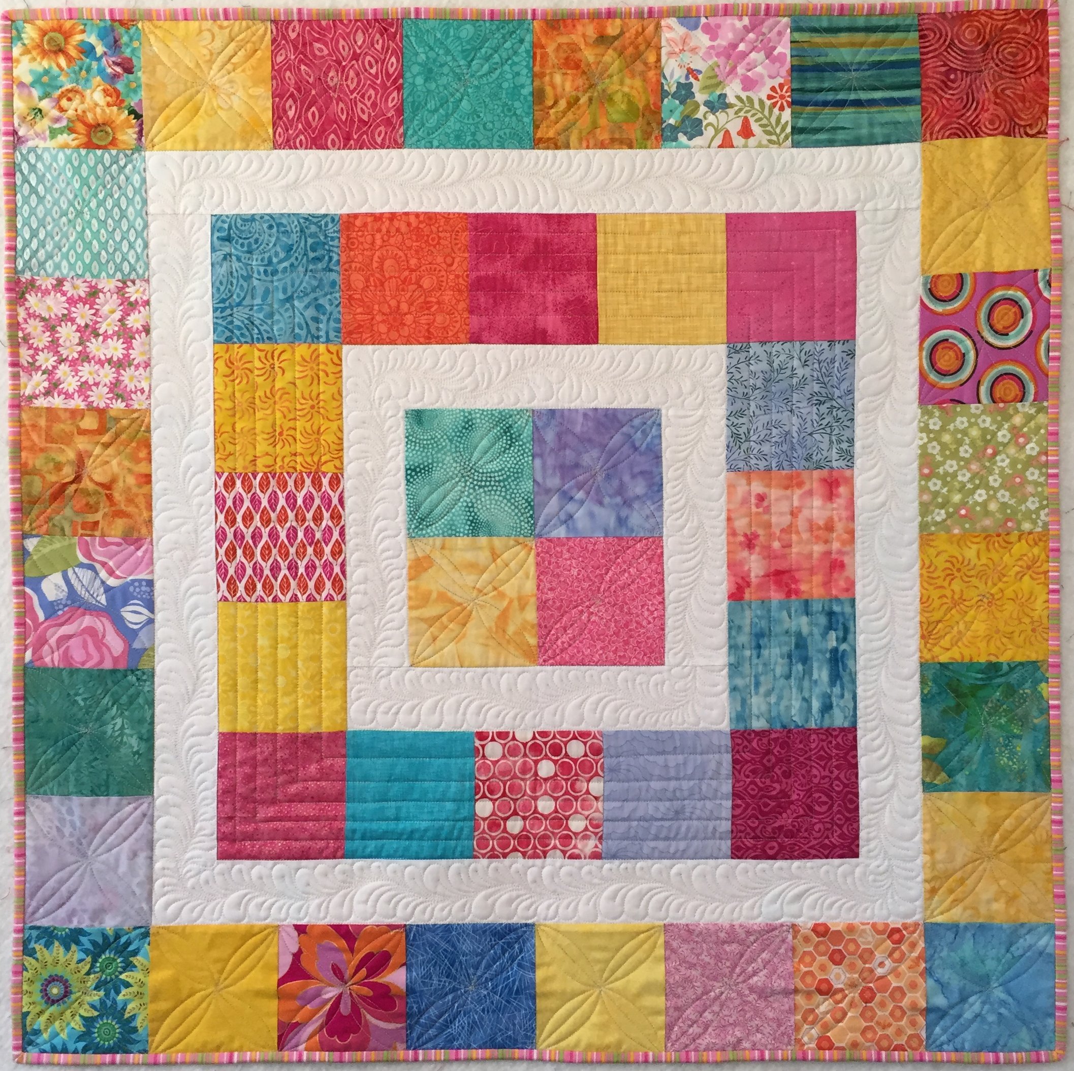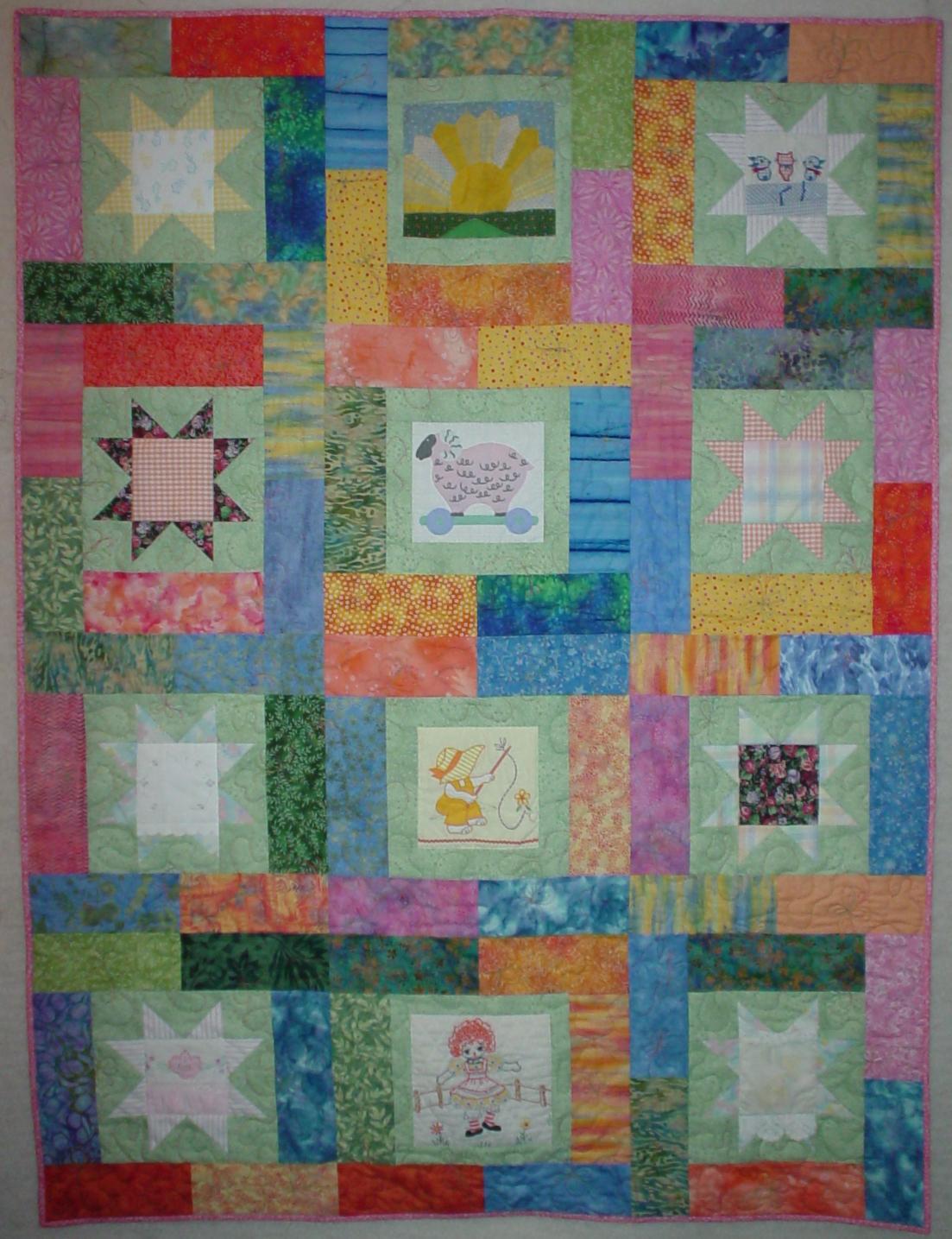 A scrappy bright quilt to welcome the new baby. Free-hand quilted with swirls and flowers.