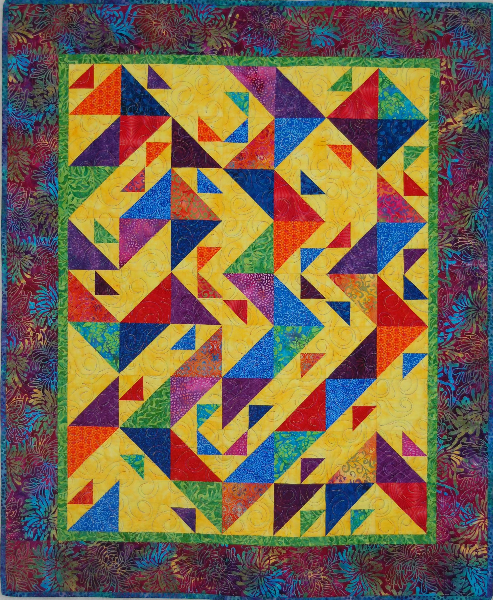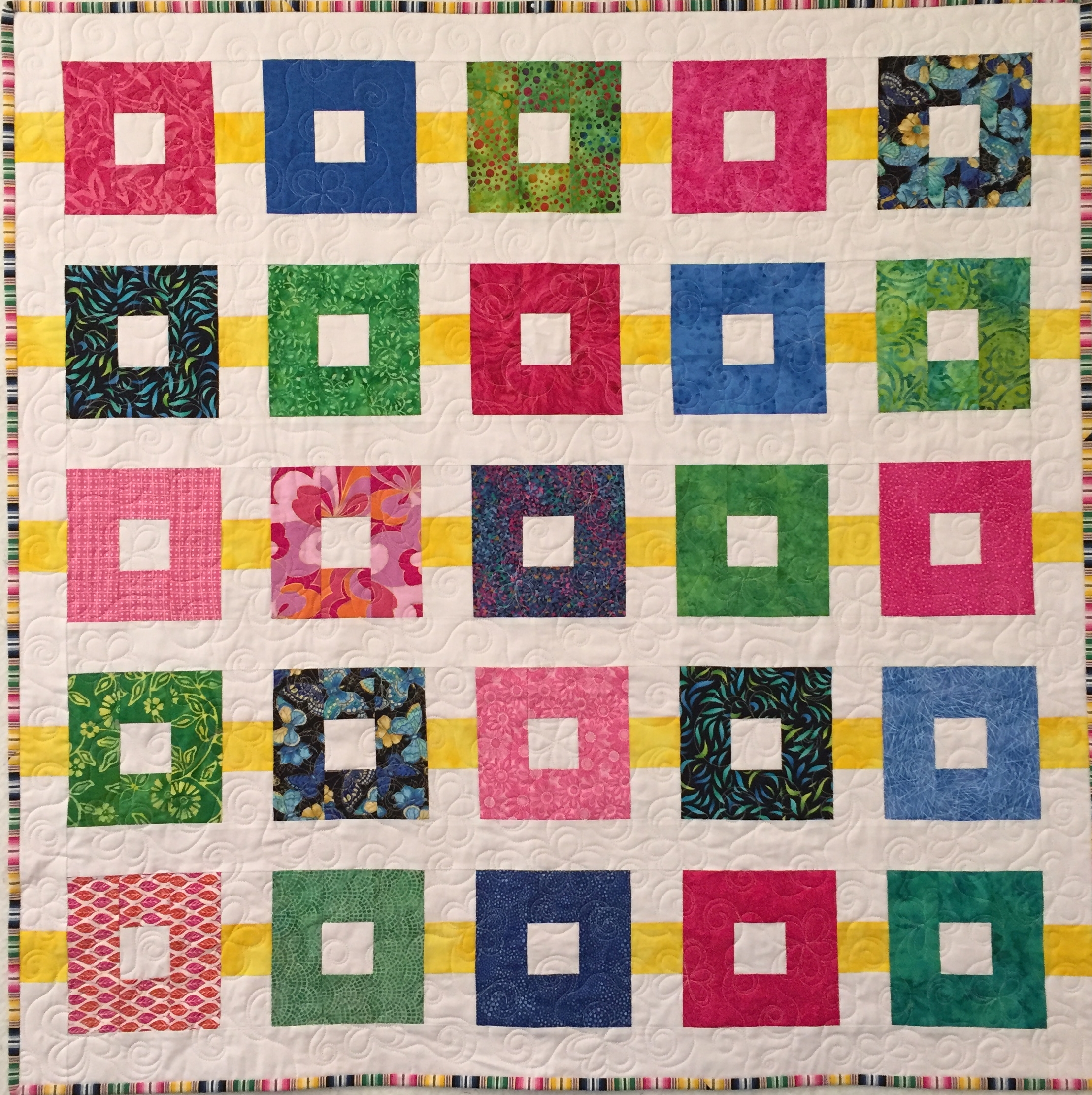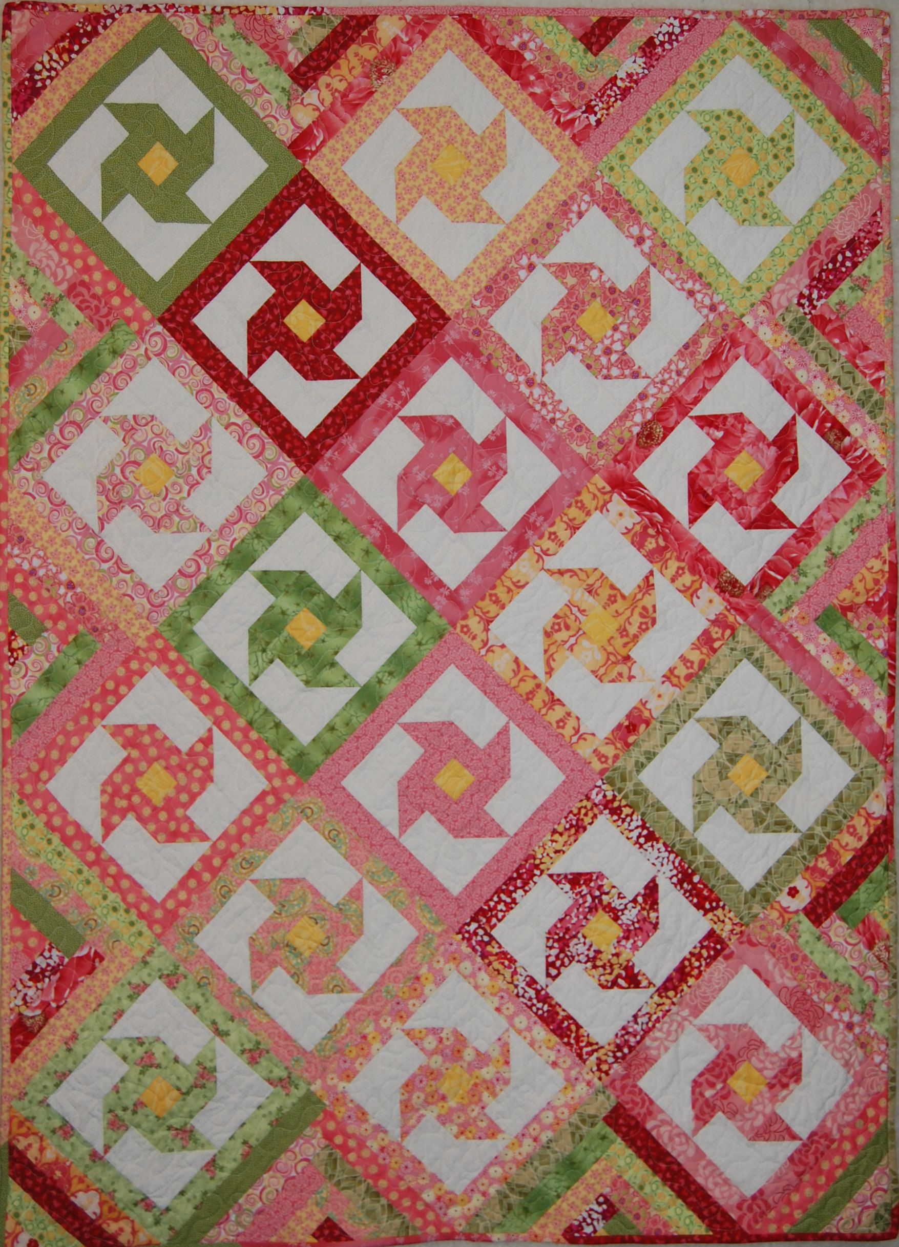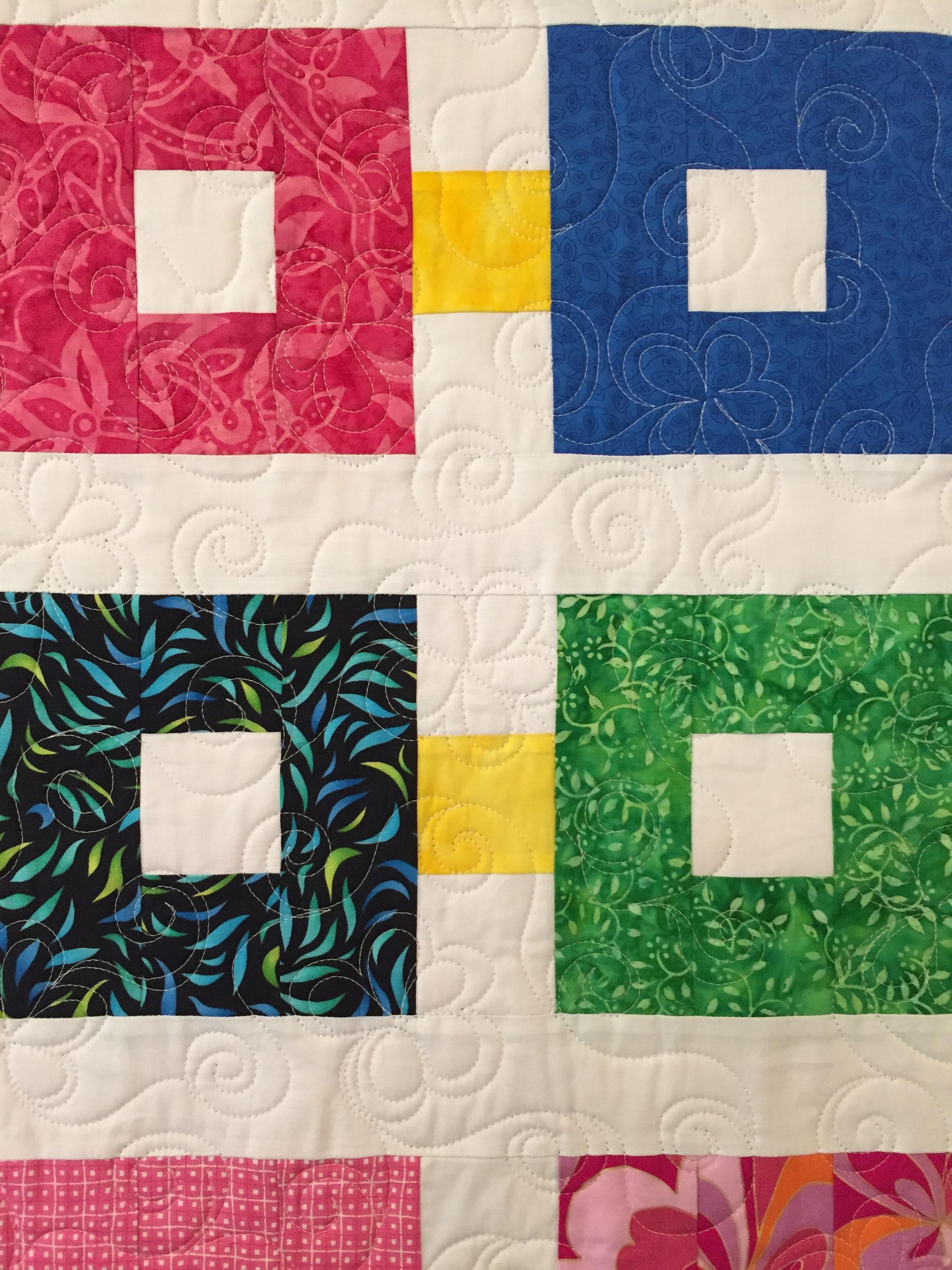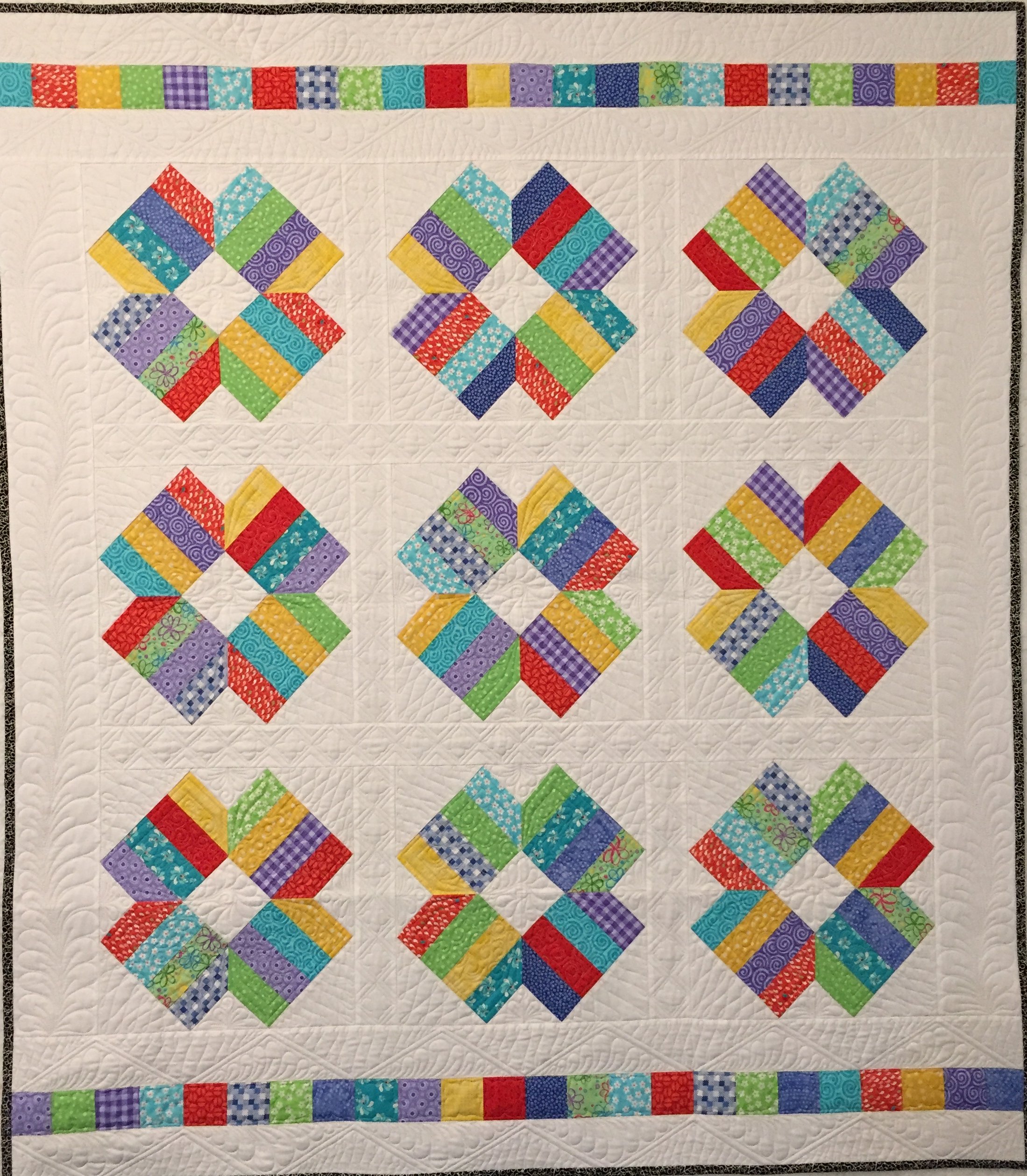 A scrappy bright quilt to welcome the new baby. Free-hand quilted with swirls and flowers.