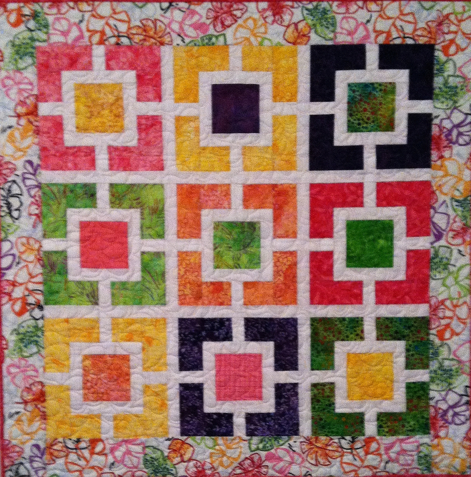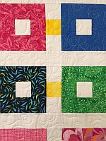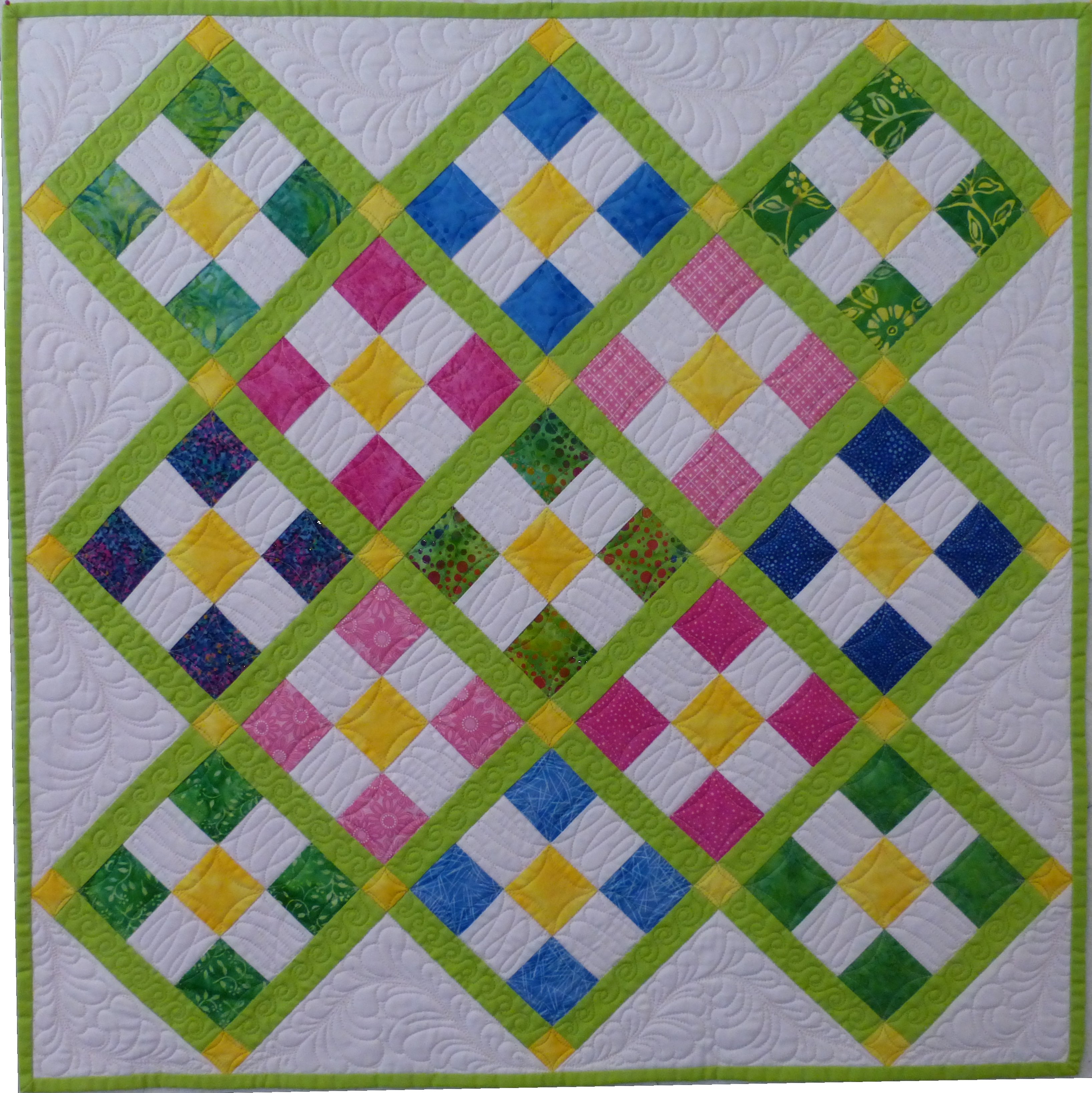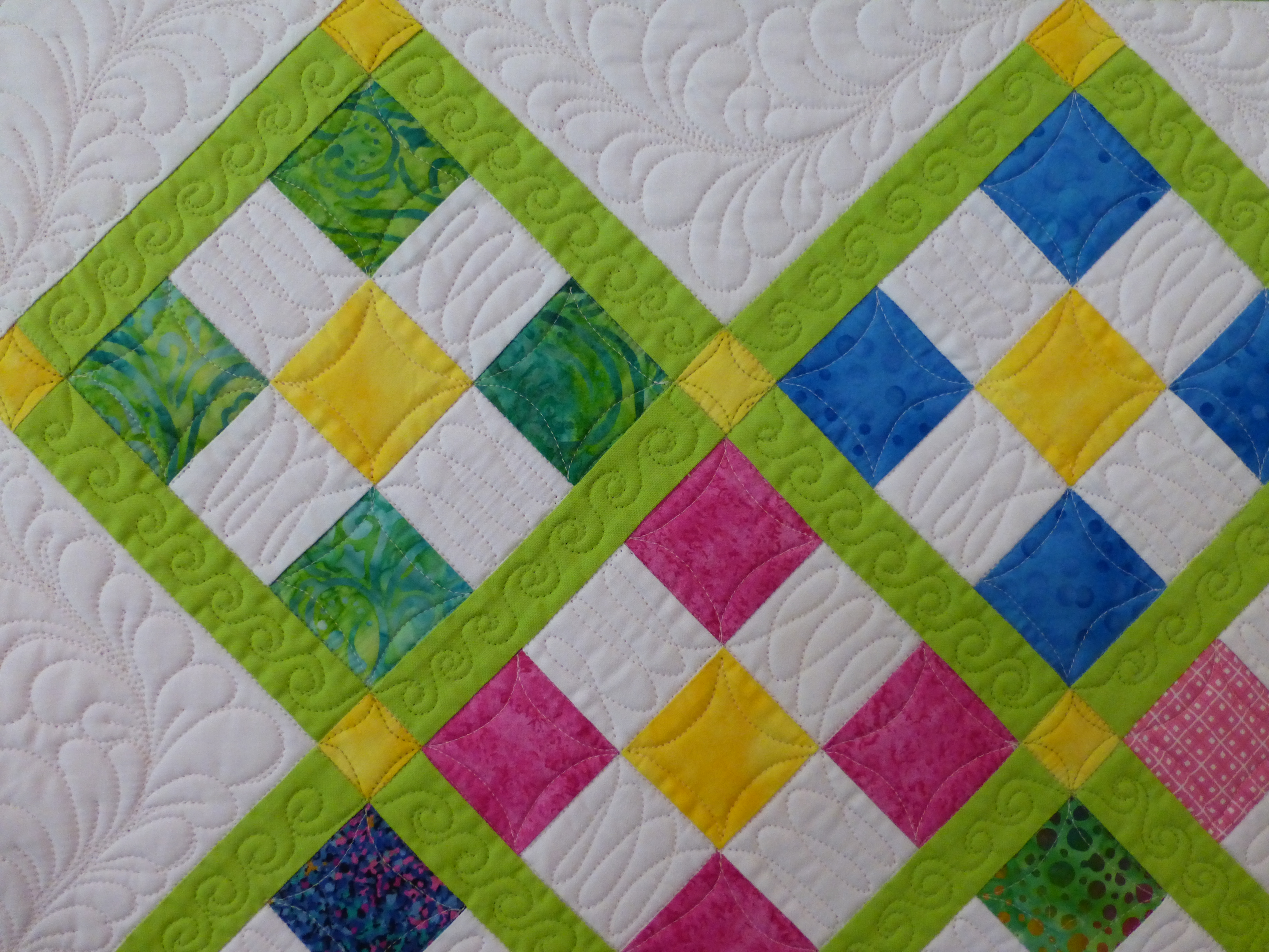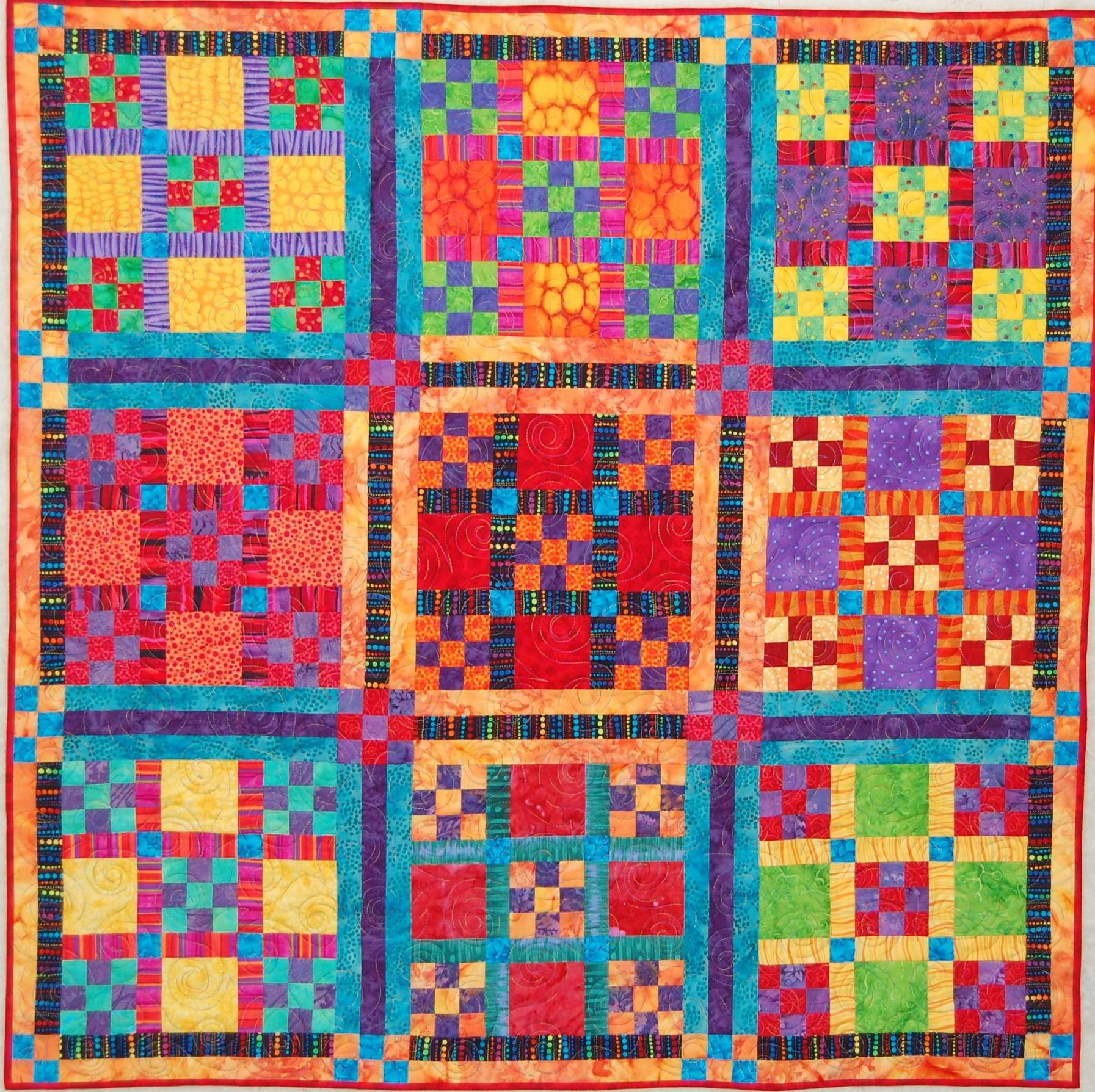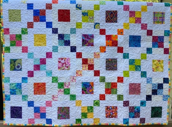 A traditional nine-patch set and quilted in a modern way. Quilting motifs include feathers, orange peels and swirls.