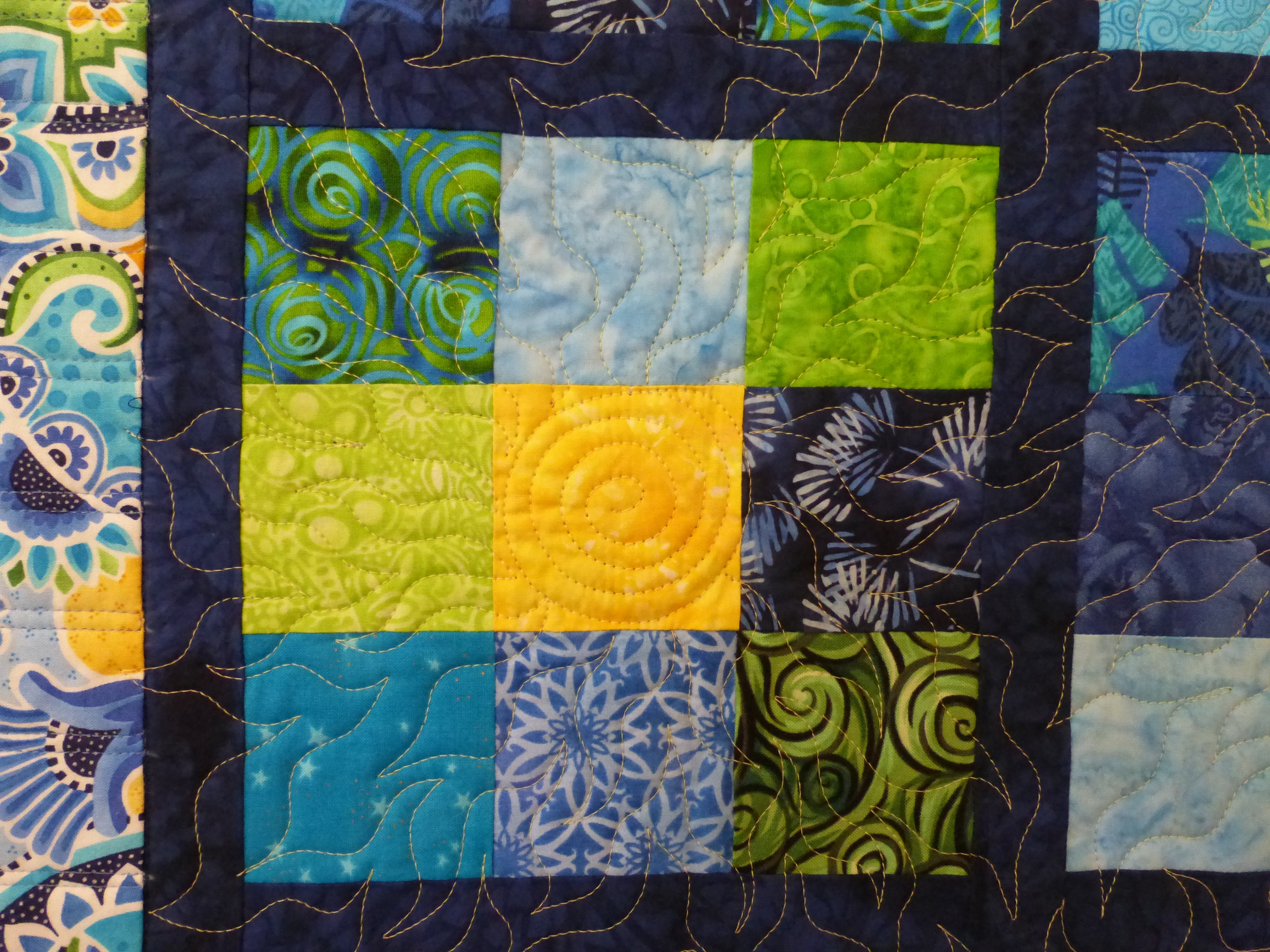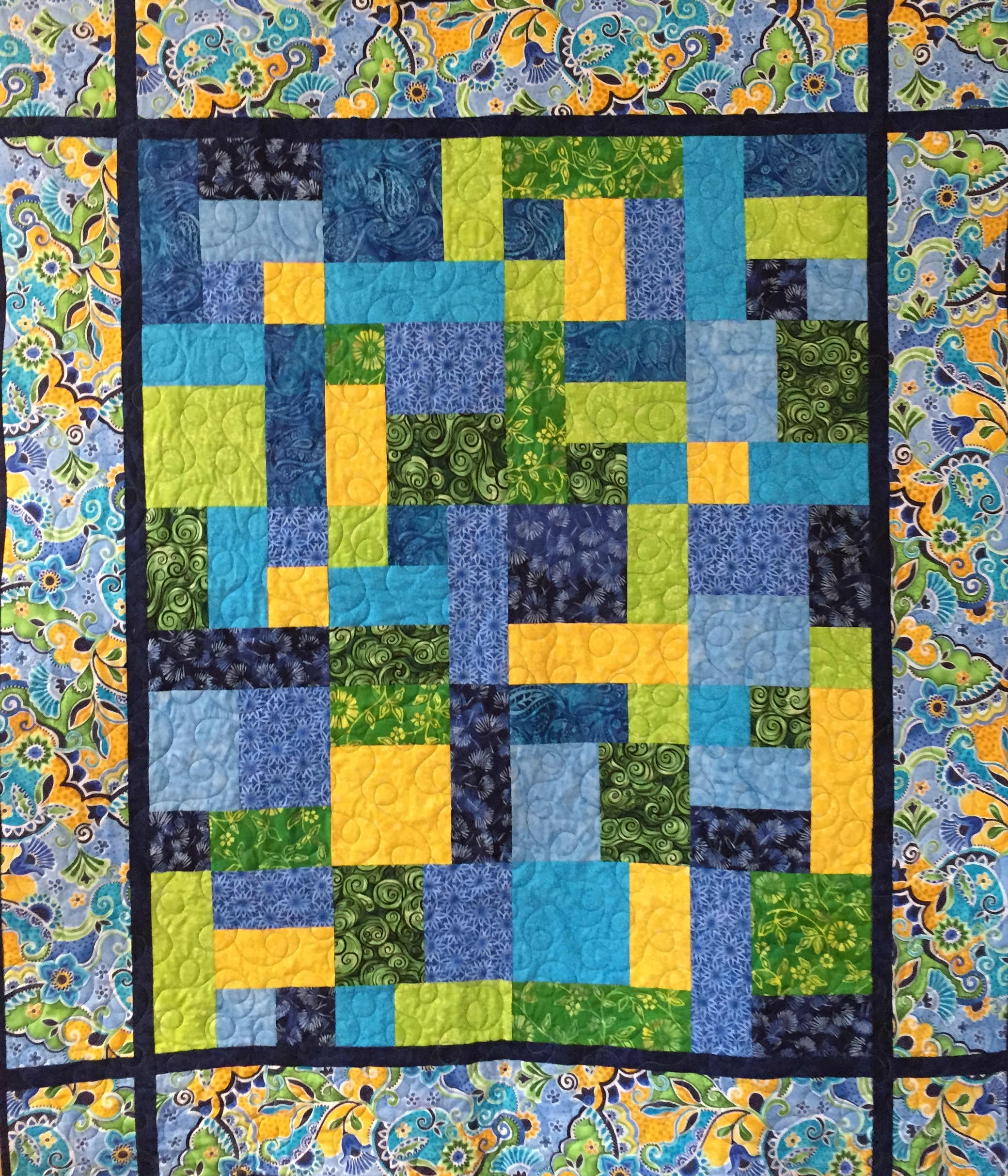 The ever-popular Yellow Brick Road pattern in blue, green and yellow. Quilted with an all-over loop-de-loop.