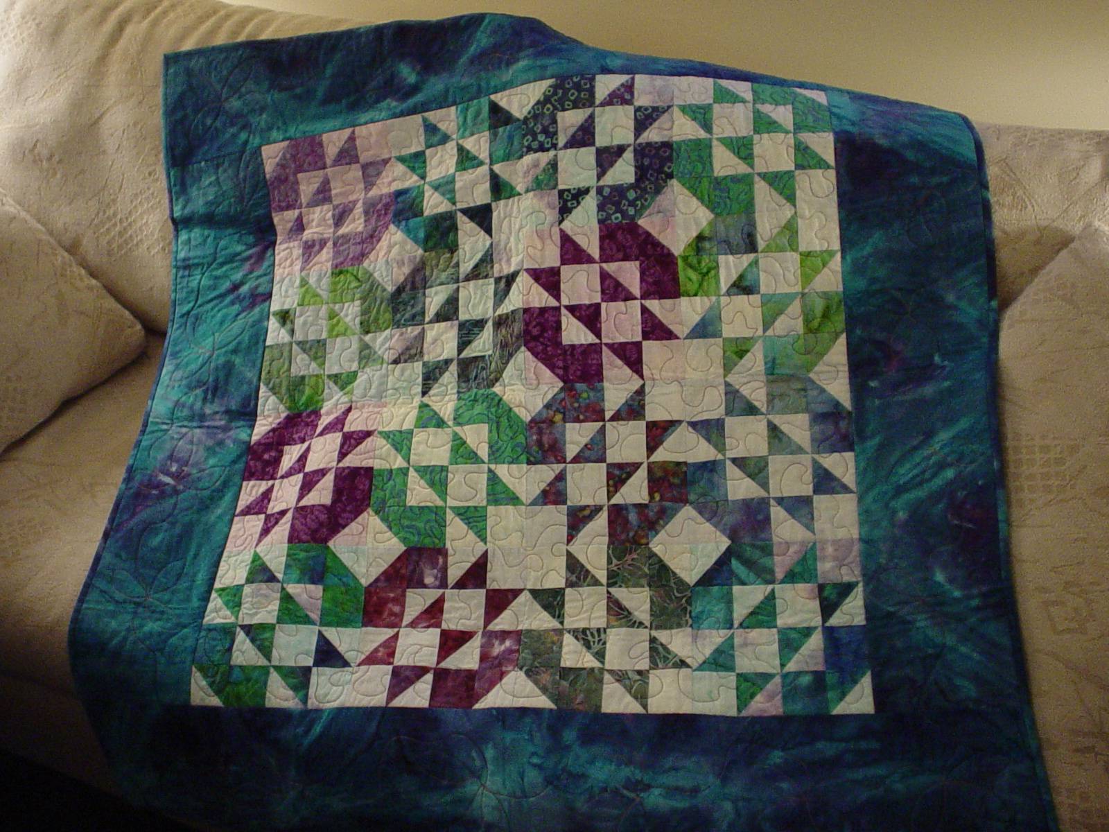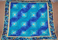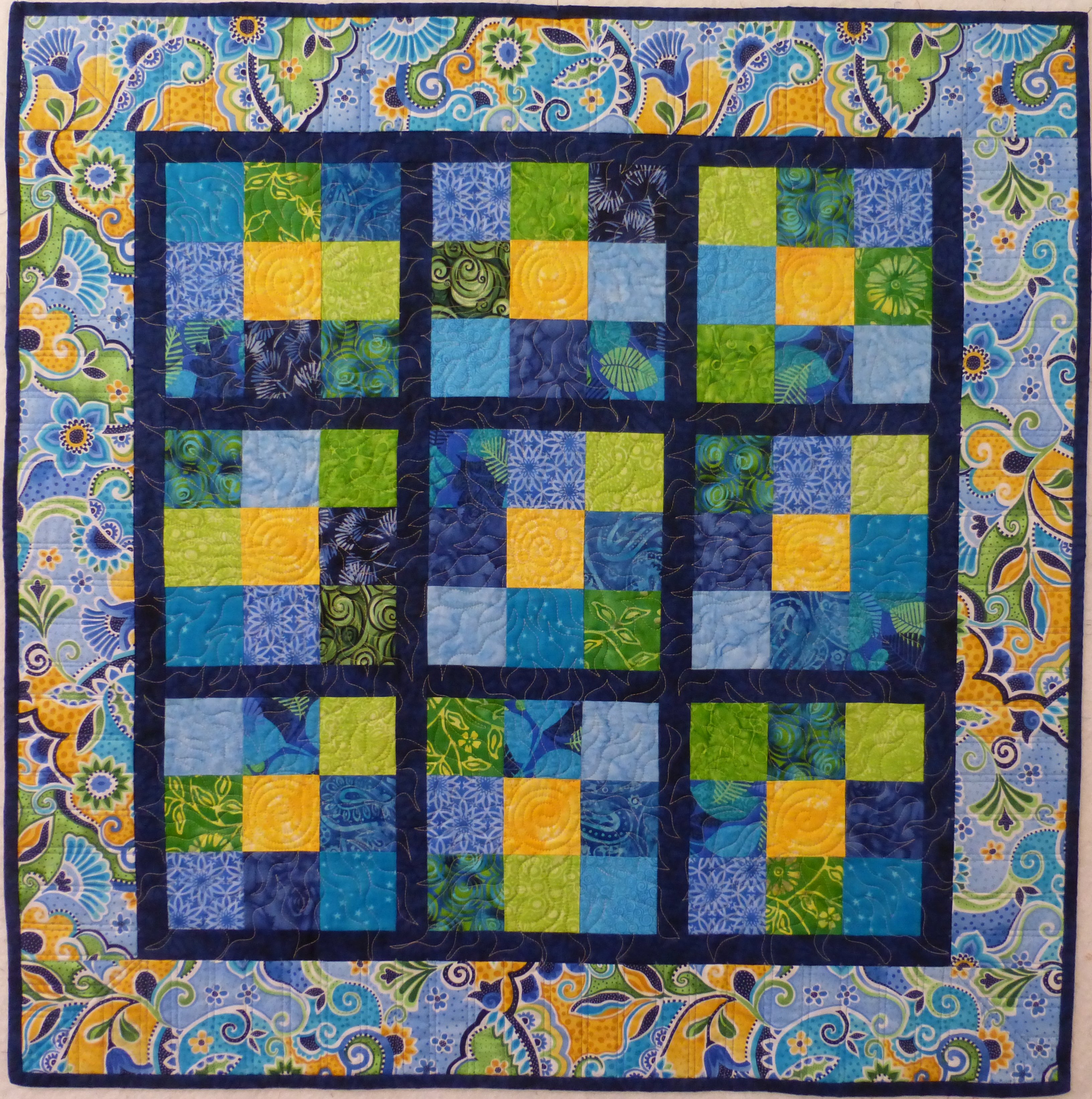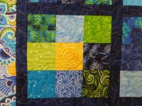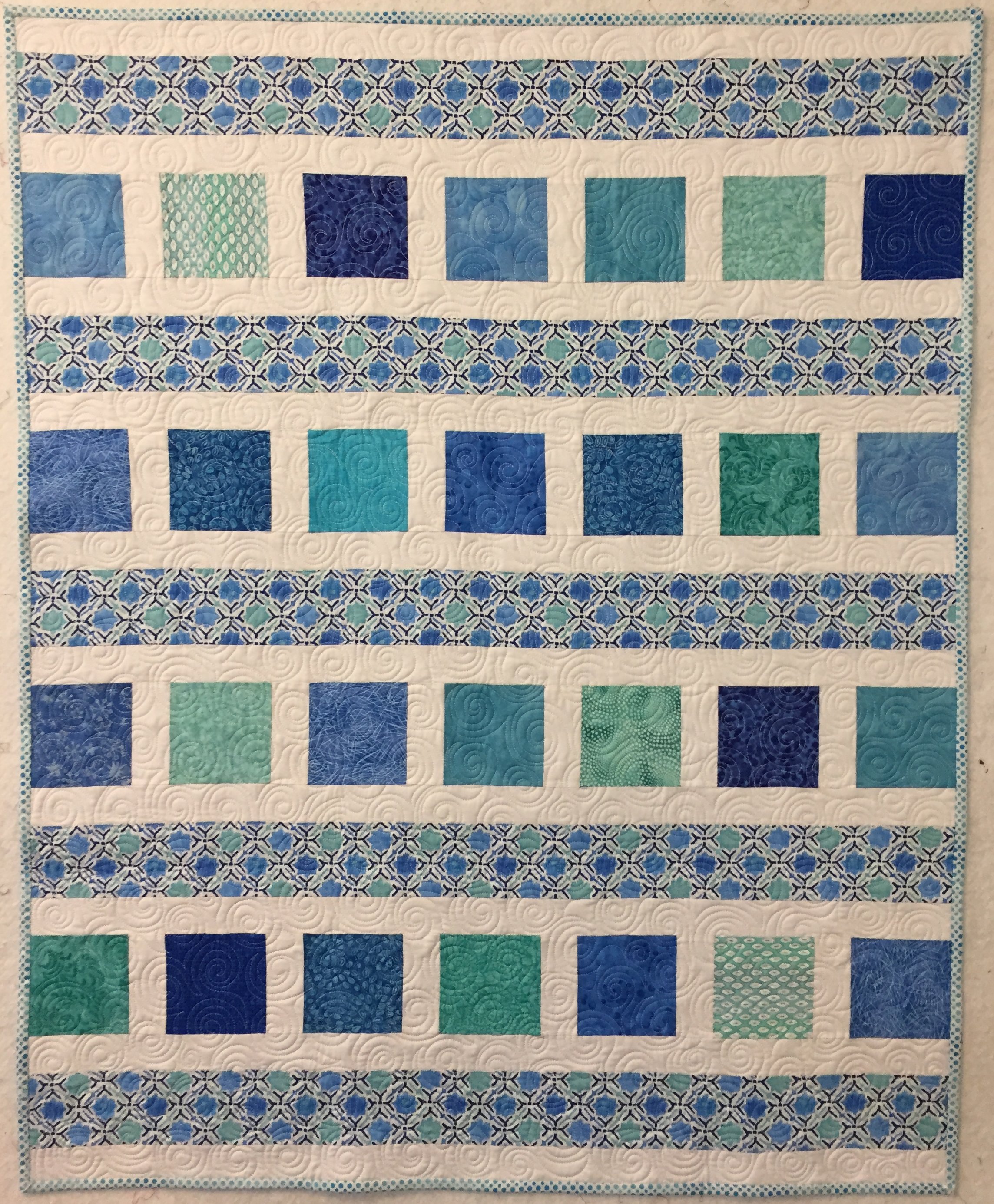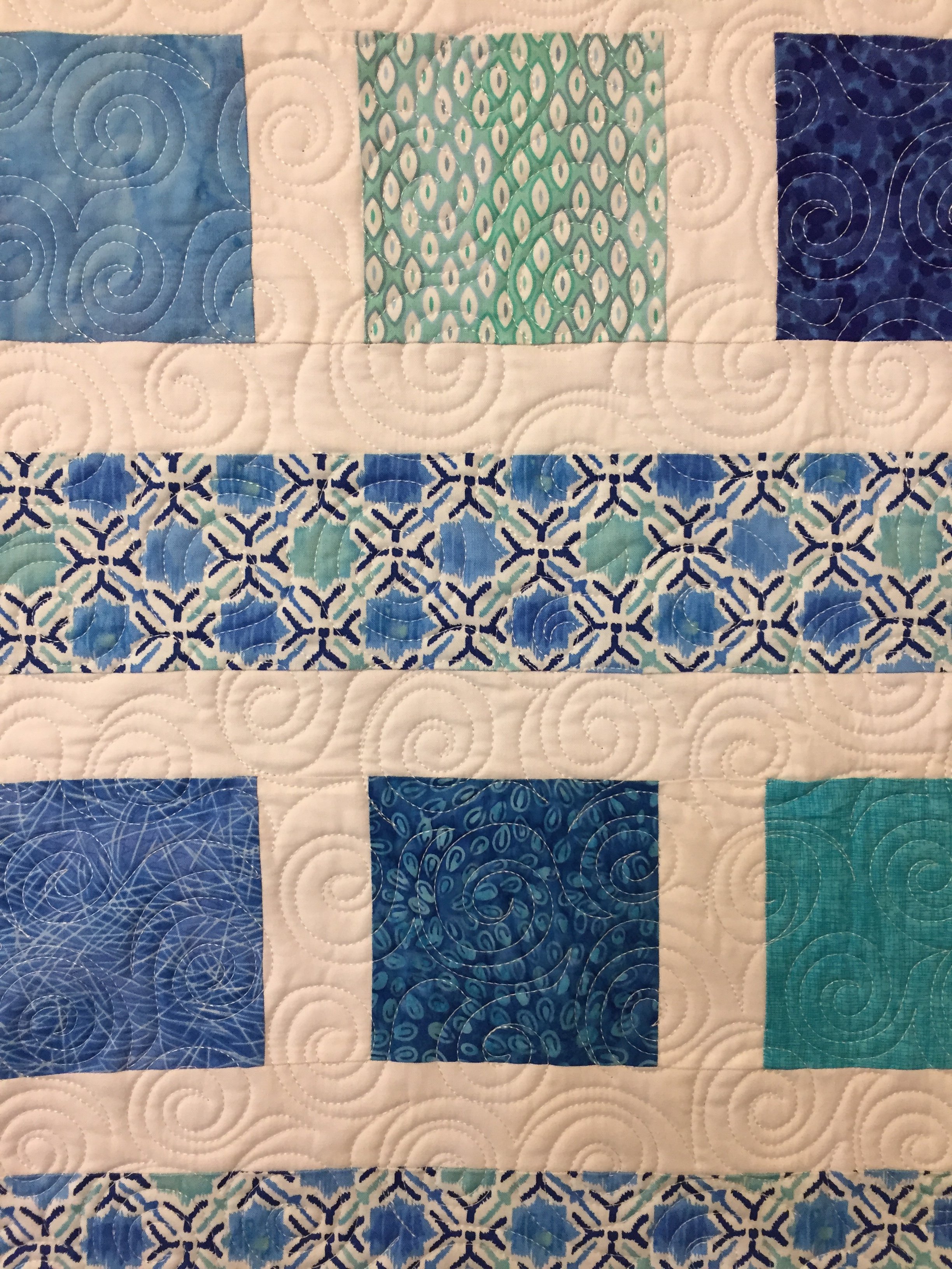 Scrappy teals and blues to welcome the new baby. Quilted in an all-over swirl design.