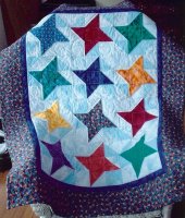 What better pattern to welcome a friends' baby than Friendship Stars! This quilt was a group effort. The background for the star blocks features a variety of light blue fabrics.