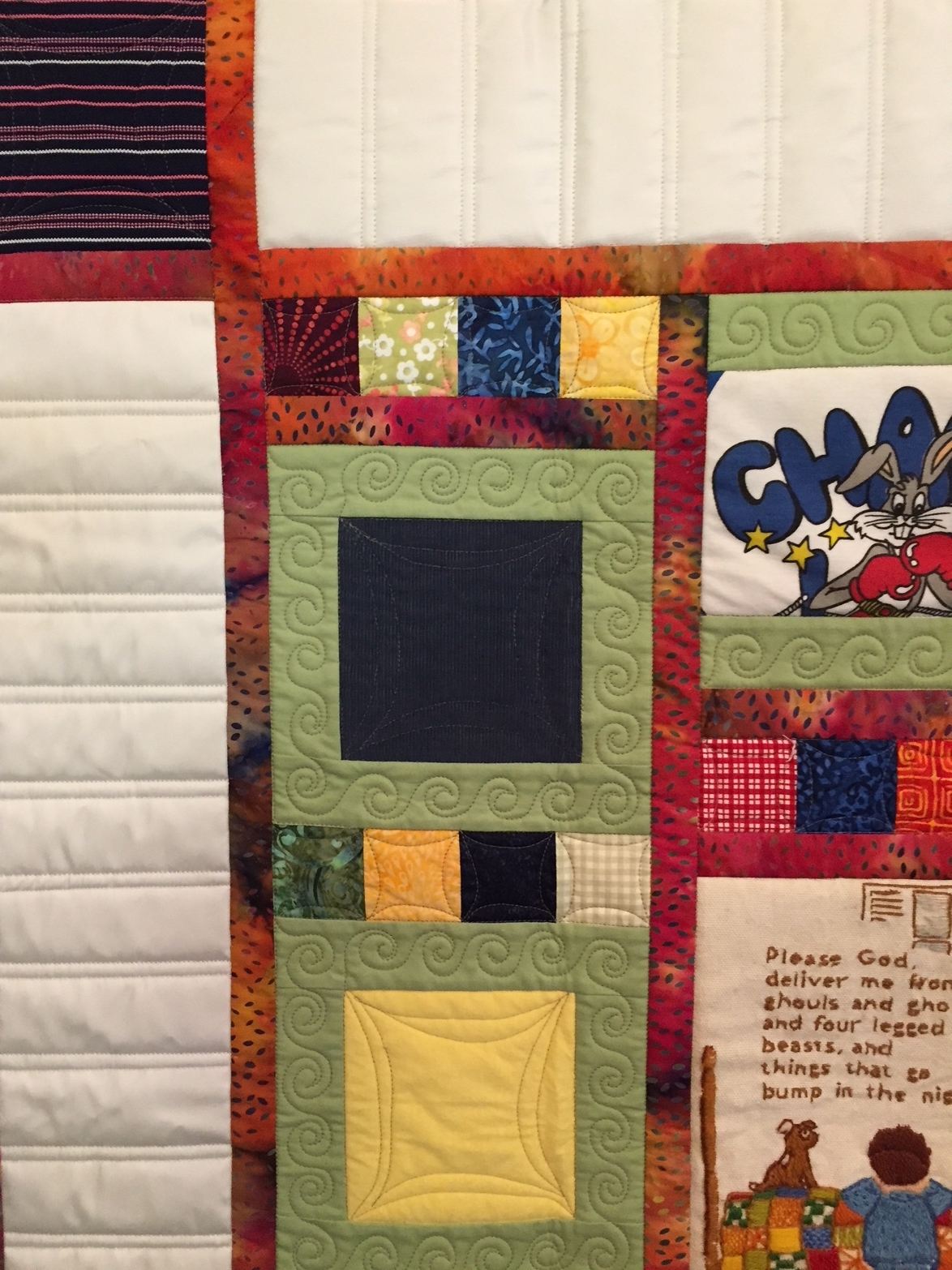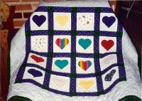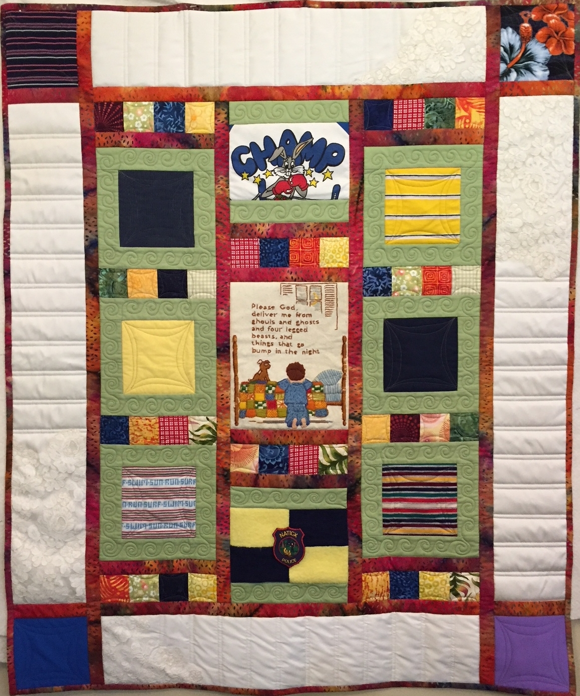 Welcoming a new baby, this quilt uses memorabilia items from three generations, including a wedding dress, needlepoint, shirts and a professional patch. Custom quilted with a variety of designs including piano keys, swirls and orange peels.