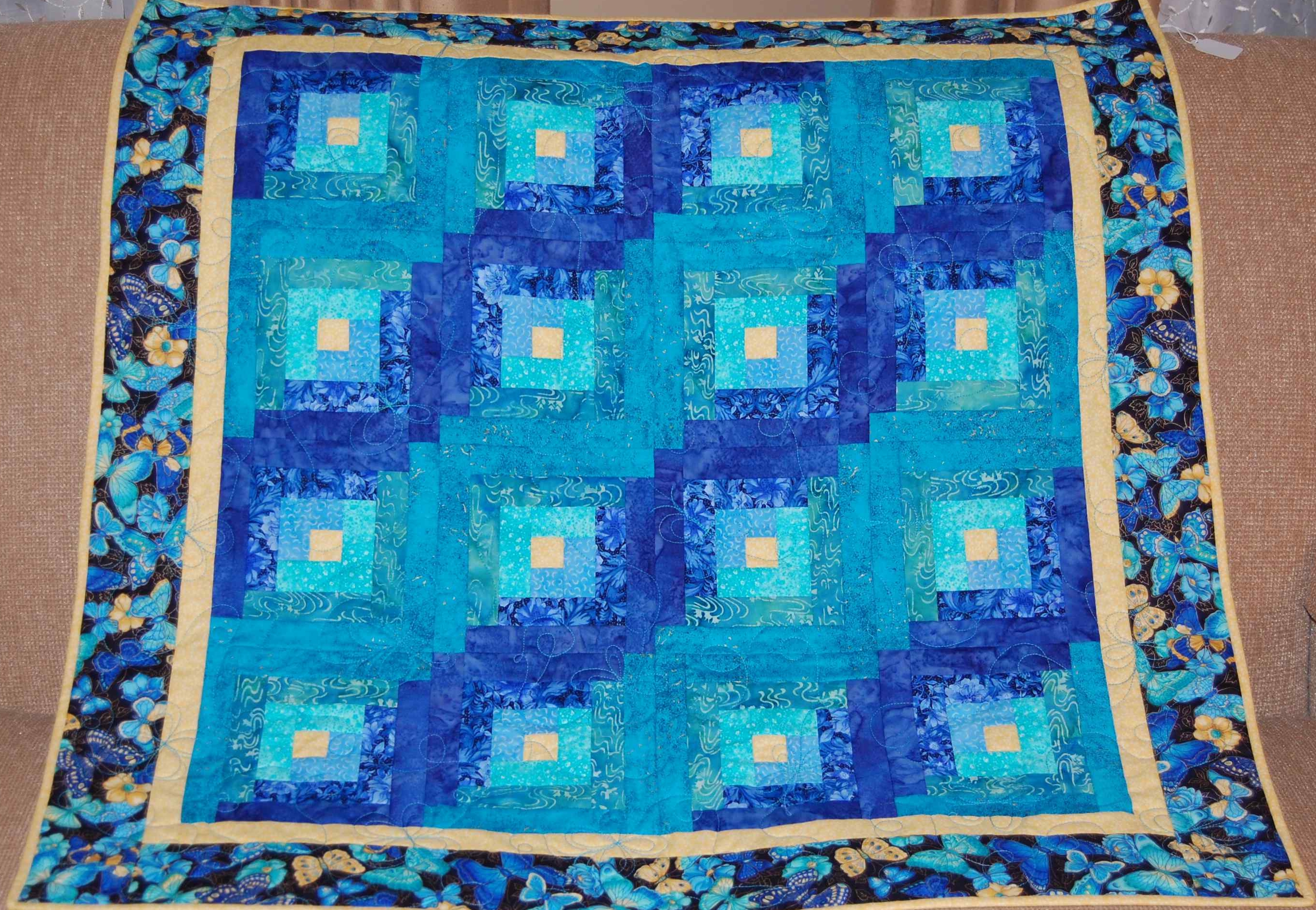 A very traditional pattern in blue and turquoise with a butterfly border. Machine quilted with a butterfly design.