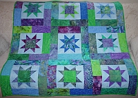 A baby gift for a family member, this quilt features batik stars in teals, purples, and greens.