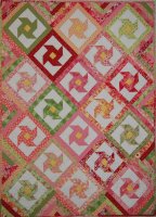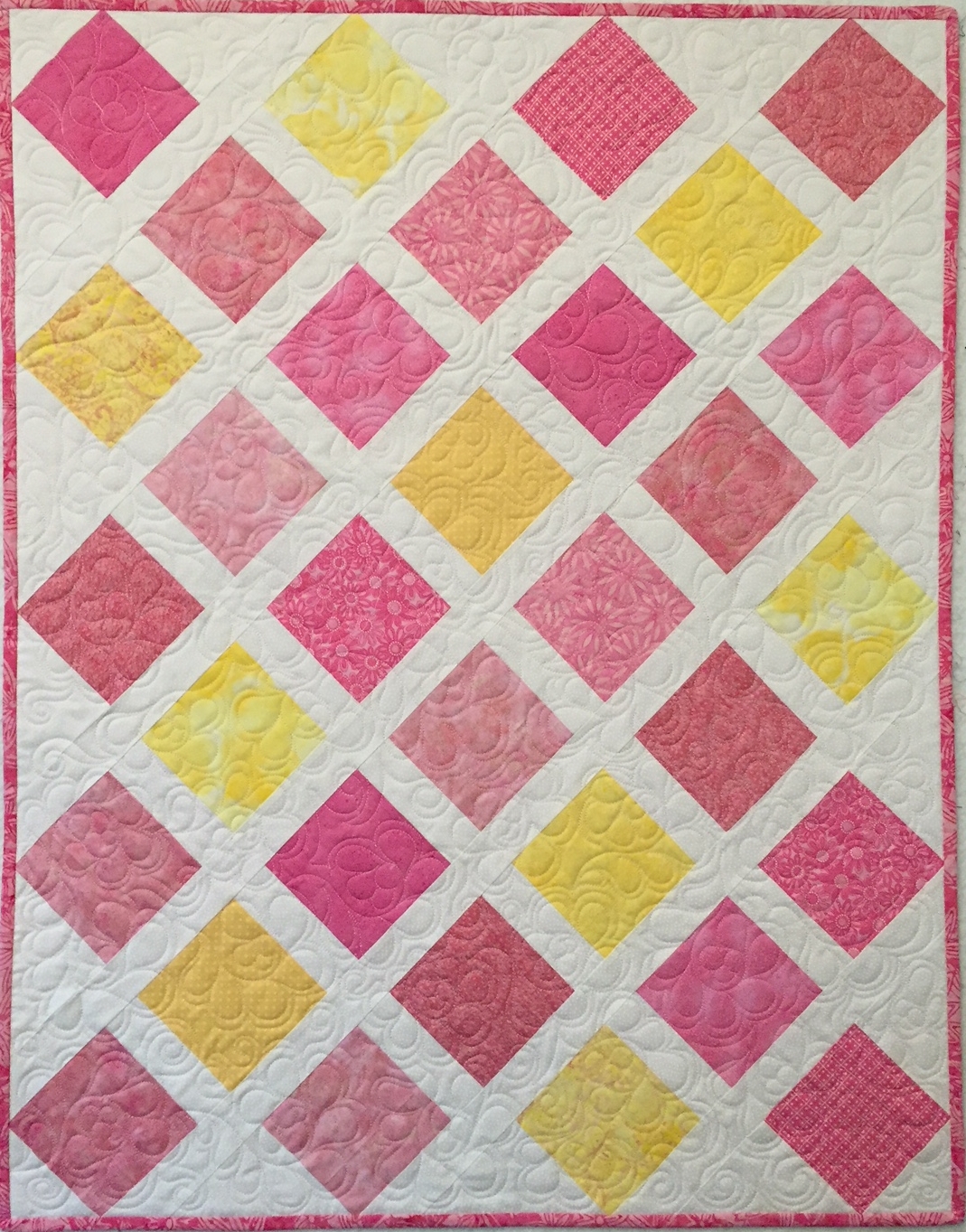 Cheerful pinks and yellows to welcome a baby daughter. Quilted with an overall design of feathered swirls.