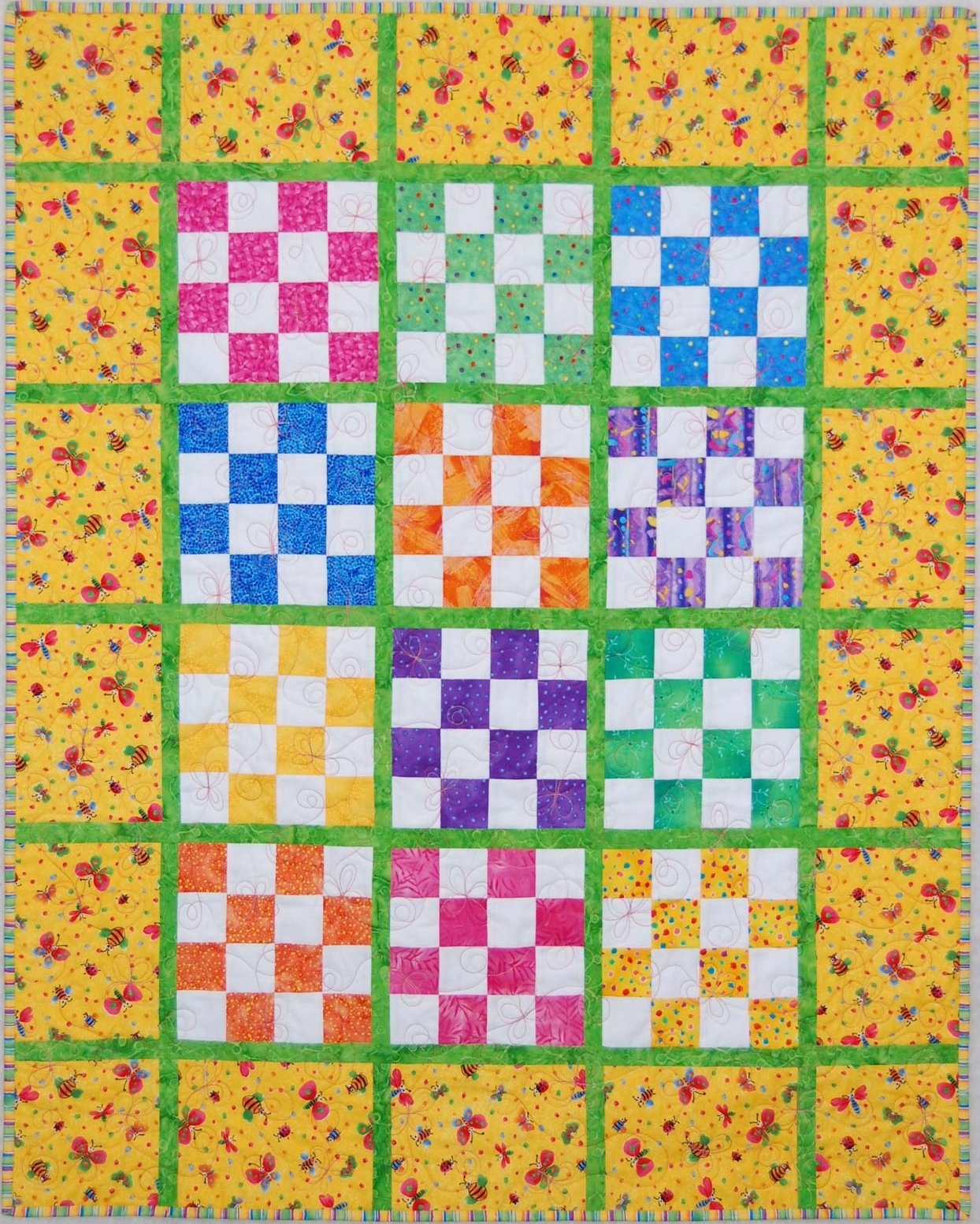 A bright and beautiful baby quilt that features a fun bug print in the border.