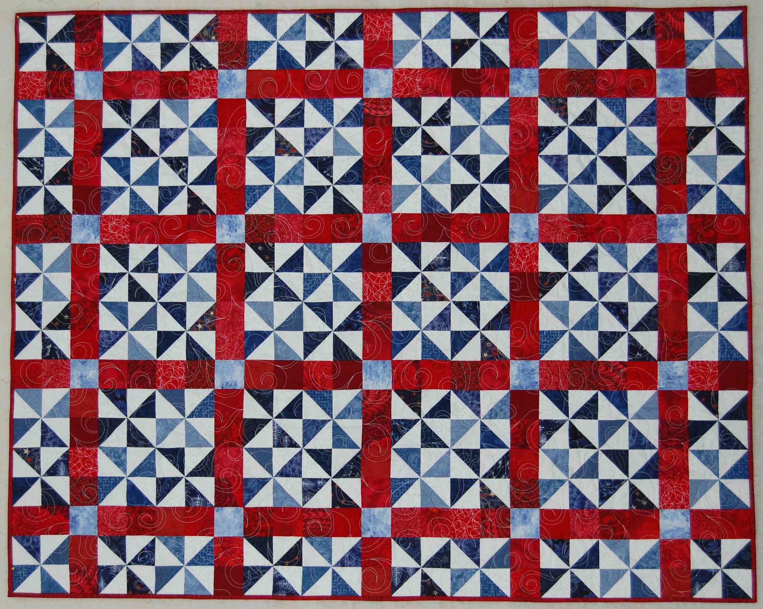 A Scrappy red, white and blue quilt featuring windmill blocks. Machine quilted with swirls to give it movement.