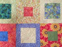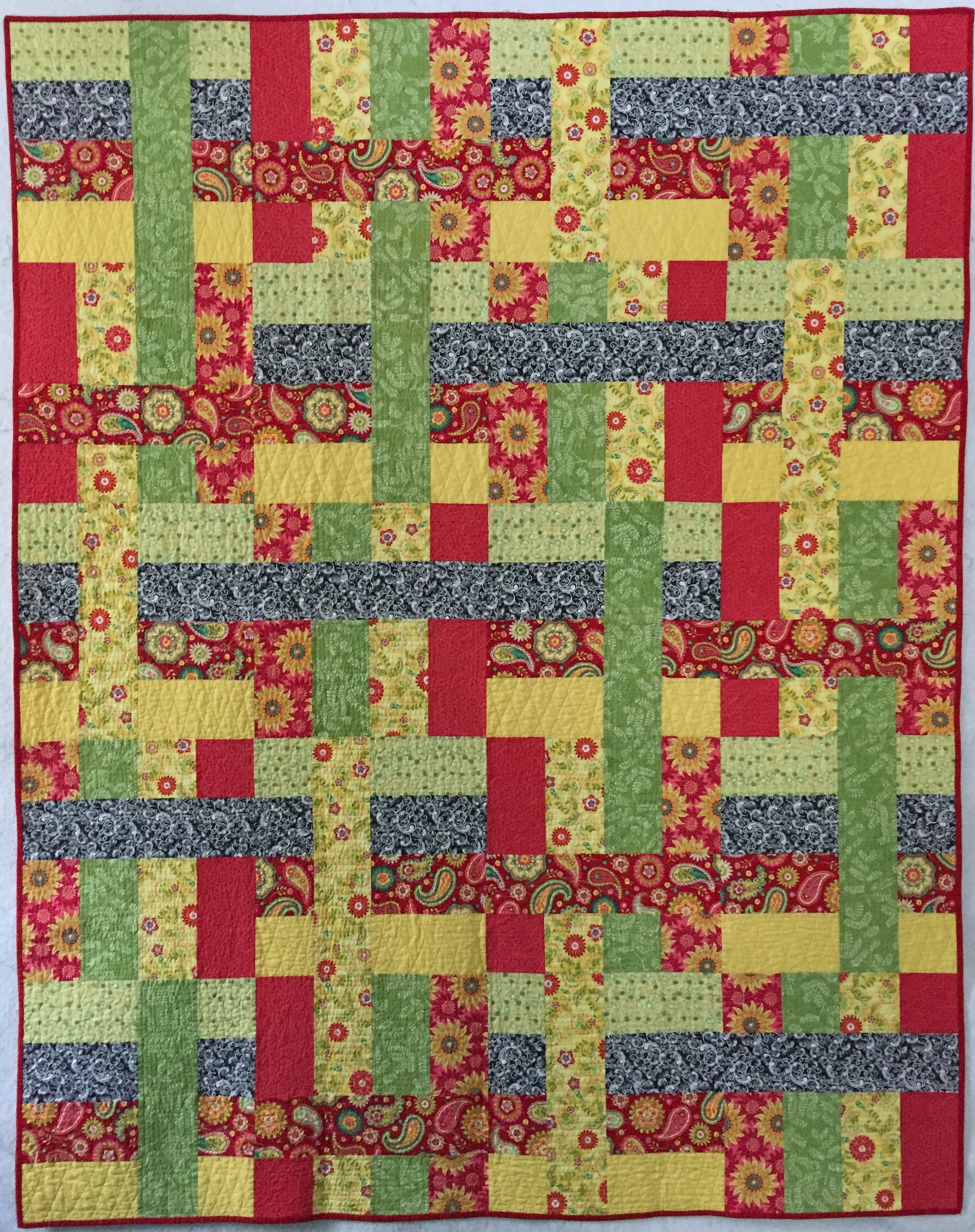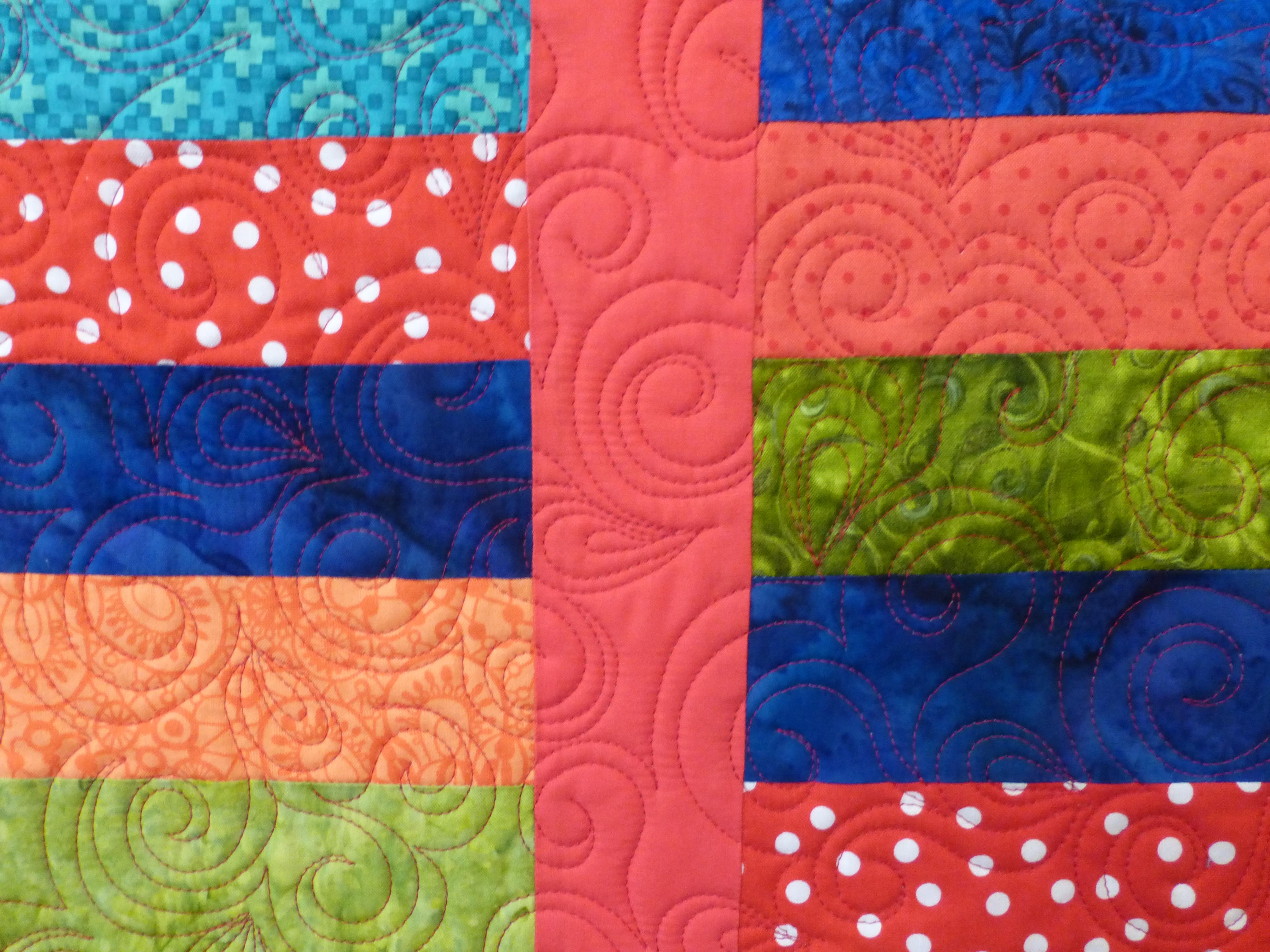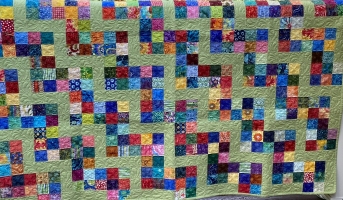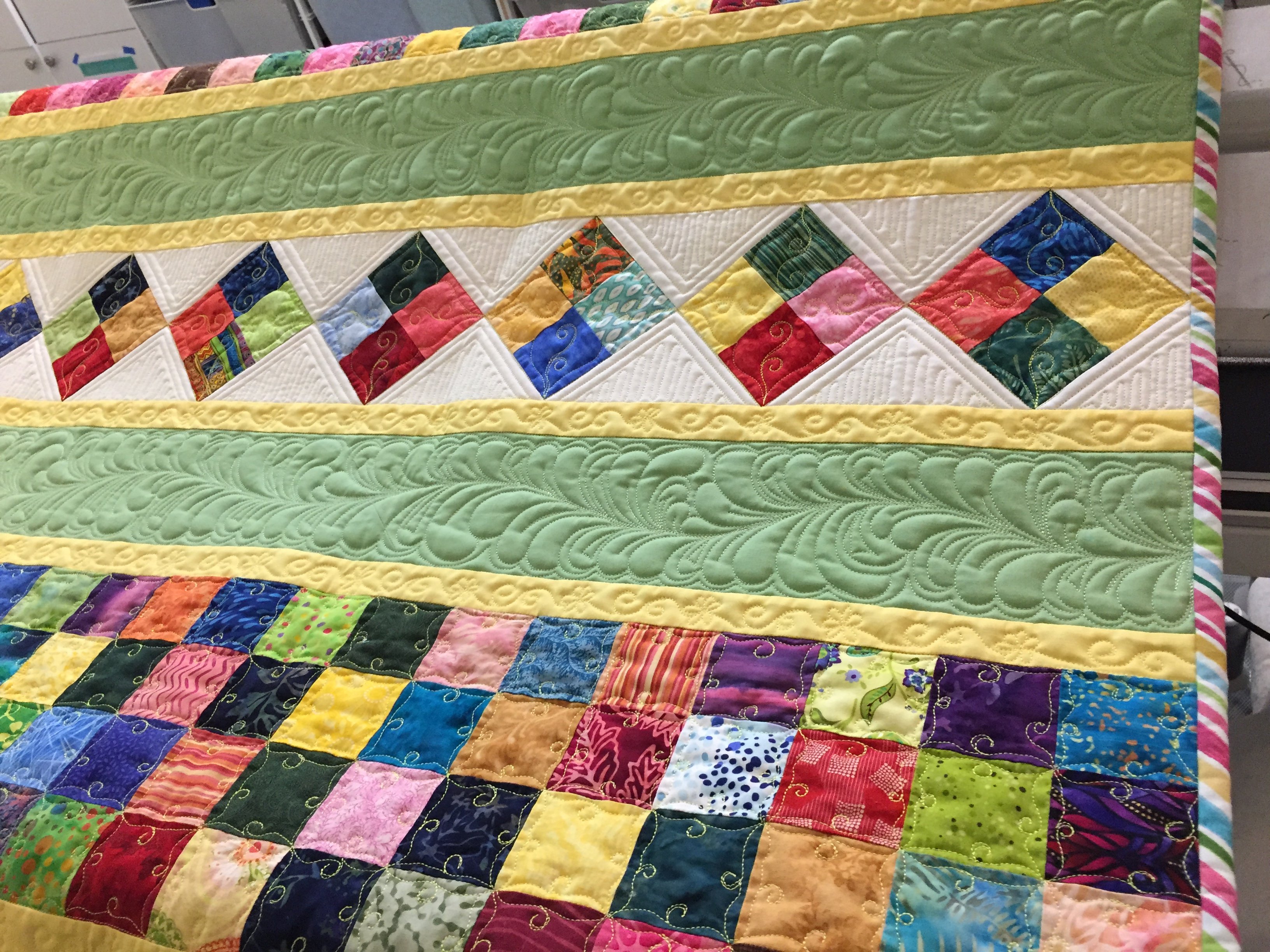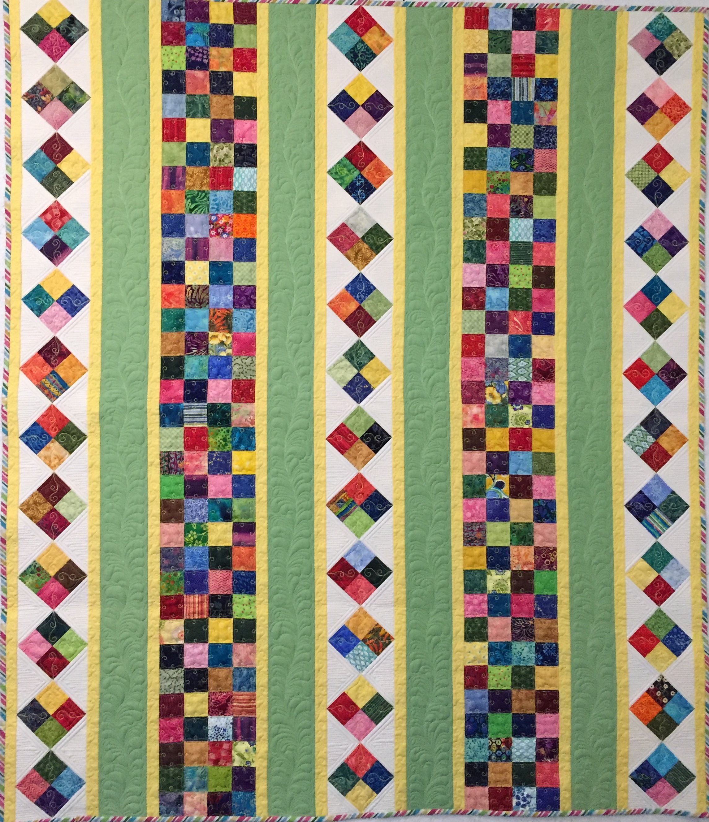 A comfort quilt in bright colors to cheer up a friend. The borders are each individually quilted with a different design.