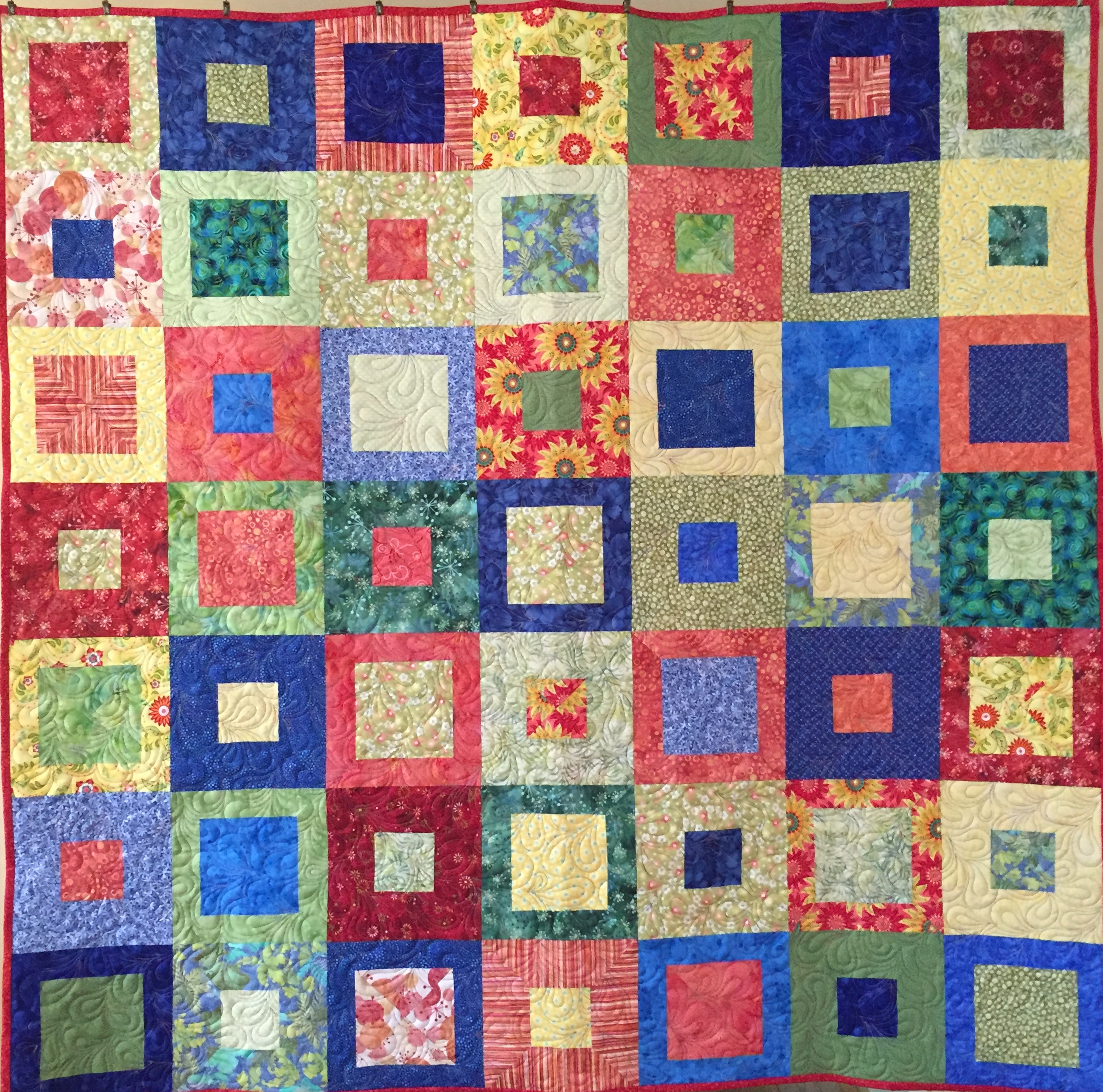 Love bright scrap quilts. This one uses the granny square block. An overall quilting design using echoed feather shapes, one of my favorite quilting designs.