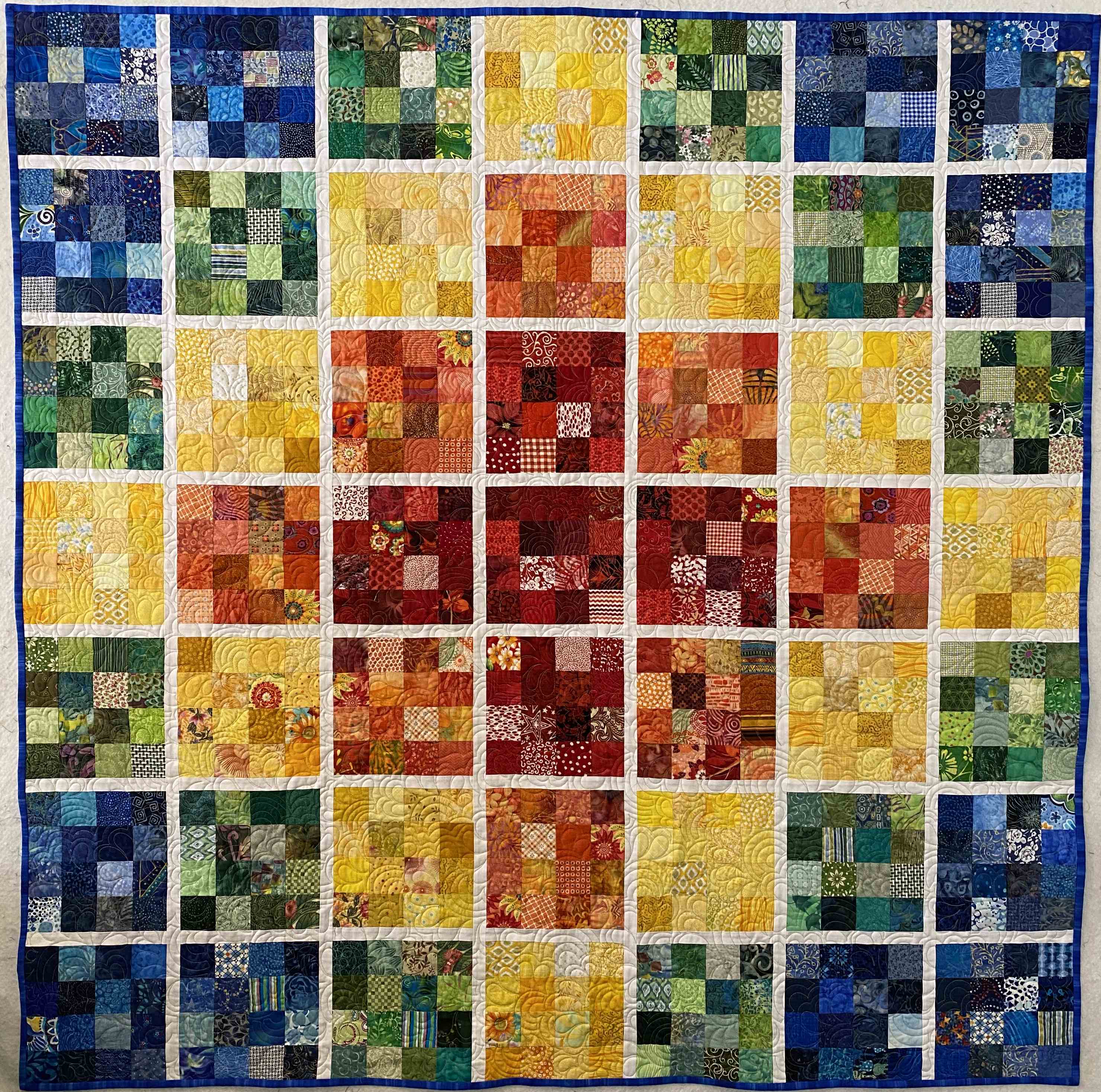 A scrap quilt using 2.5" squares leftover from many other projects. Based on the 2021 Color Block Quilt-along by Debby Brown.