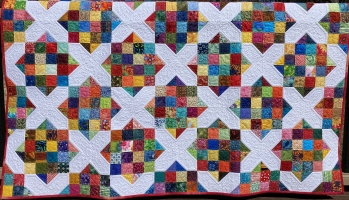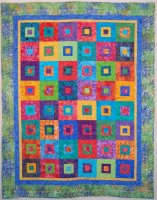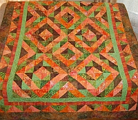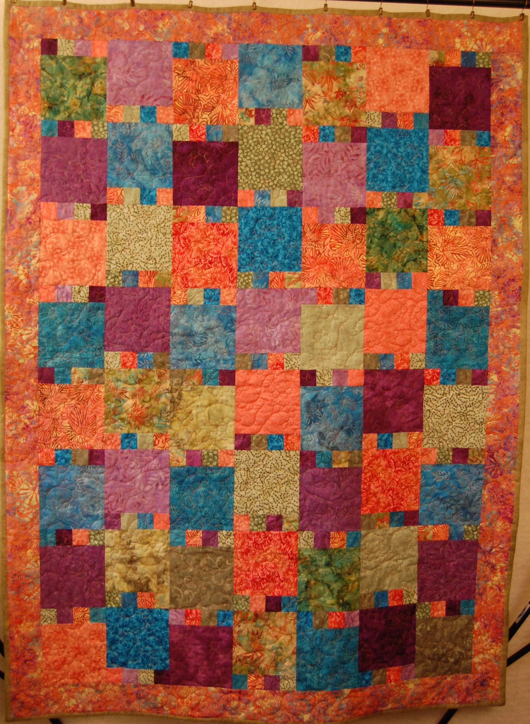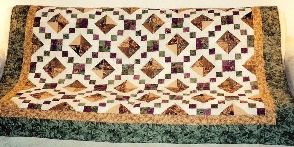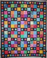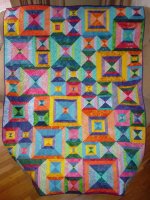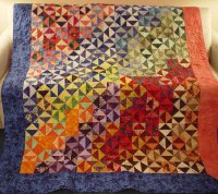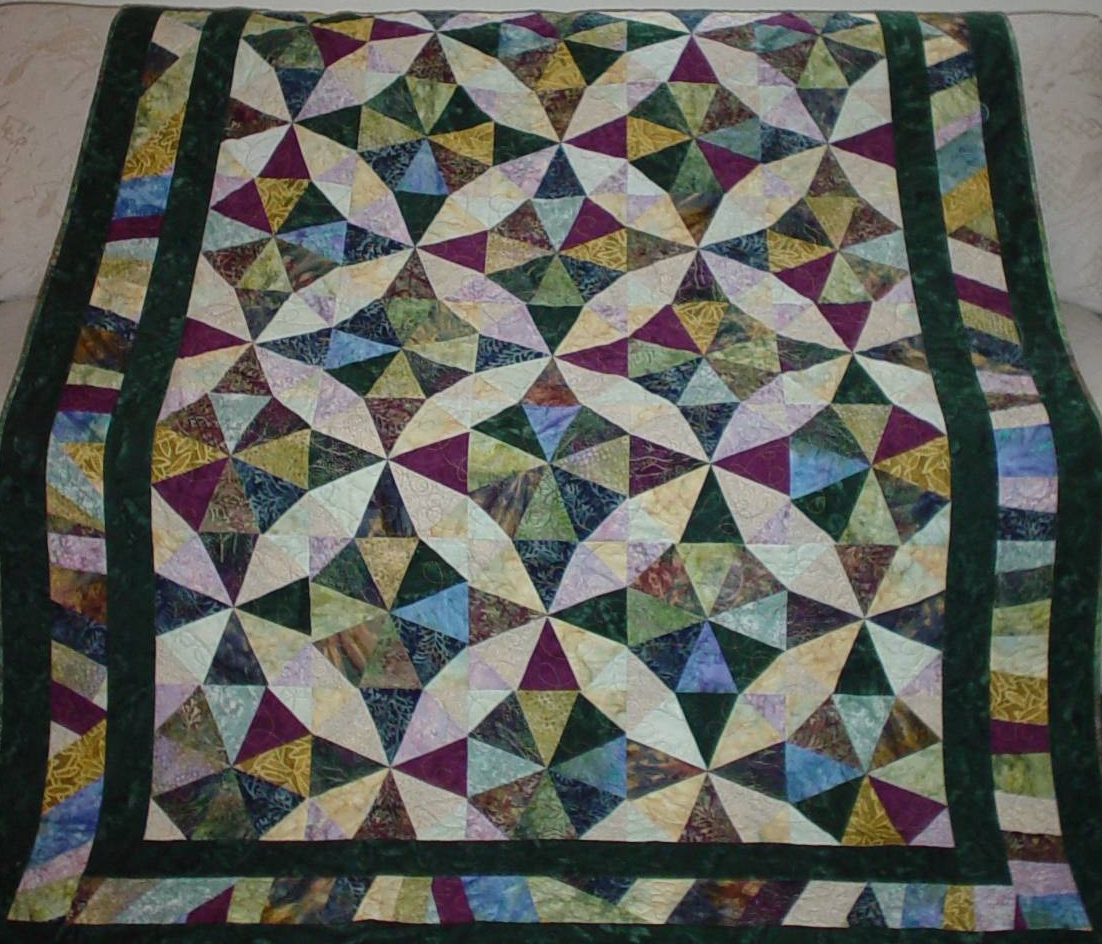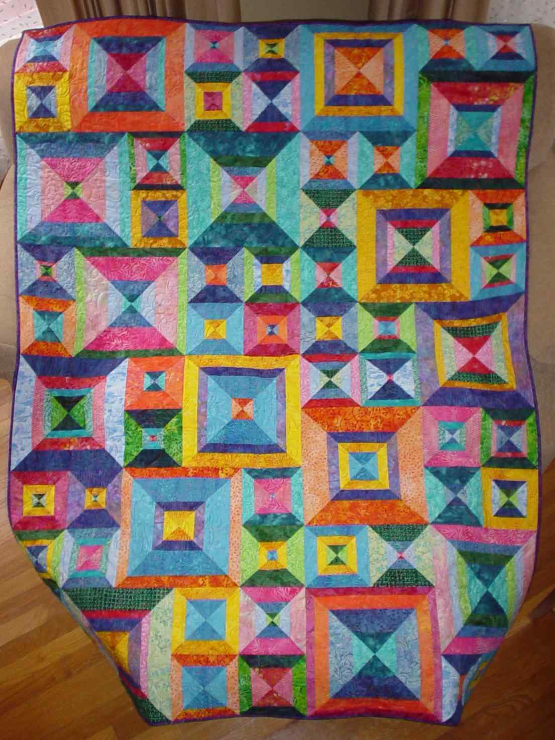 This bright colored quilt features batik fabrics "hourglass" blocks in two sizes. It serves as a comfort quilt for a dear friend.