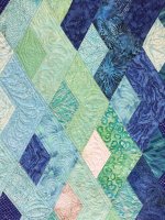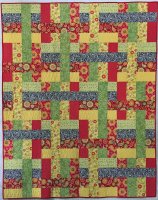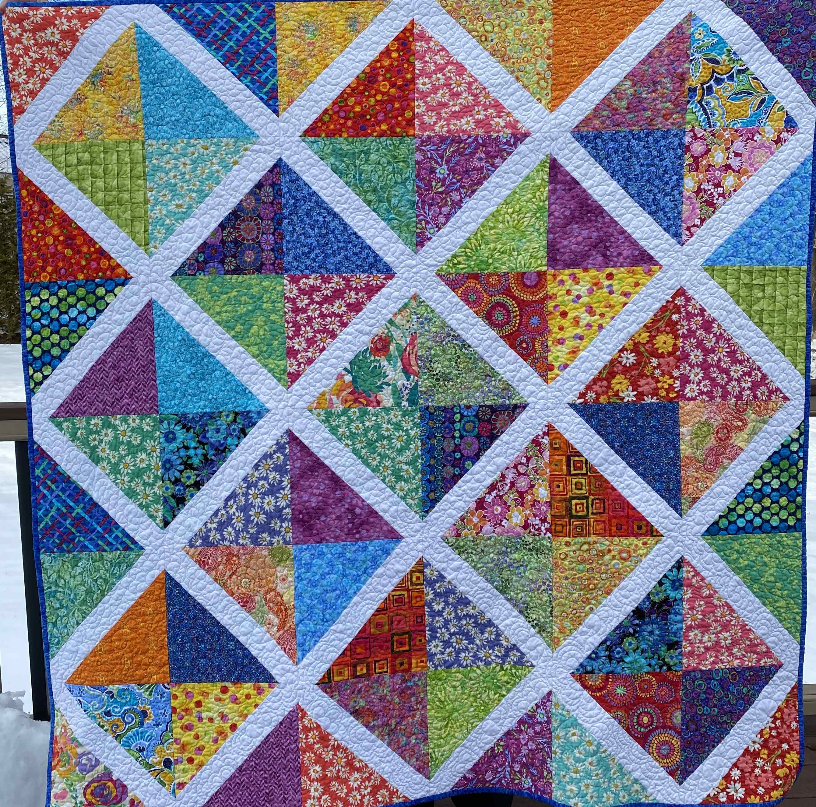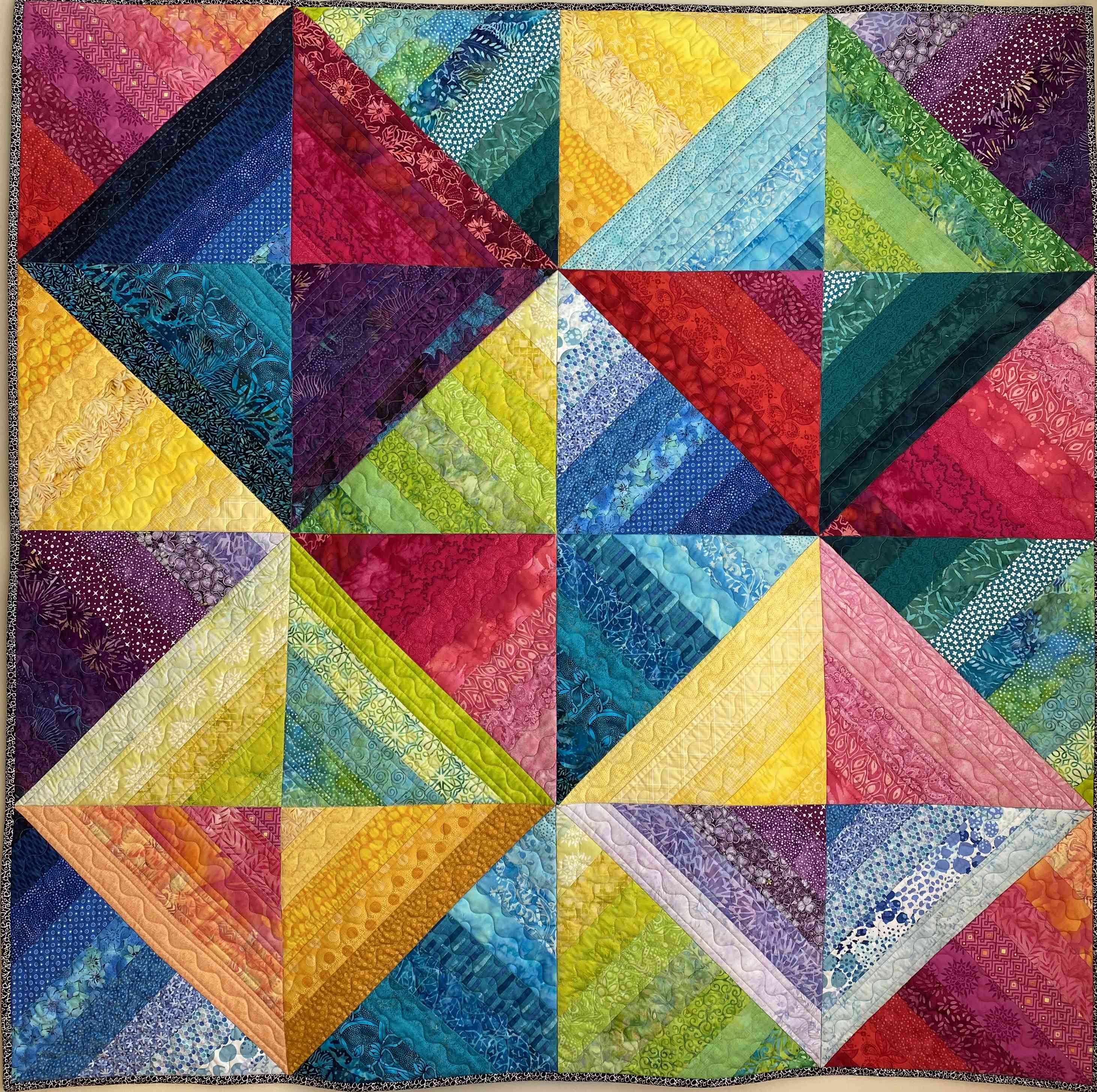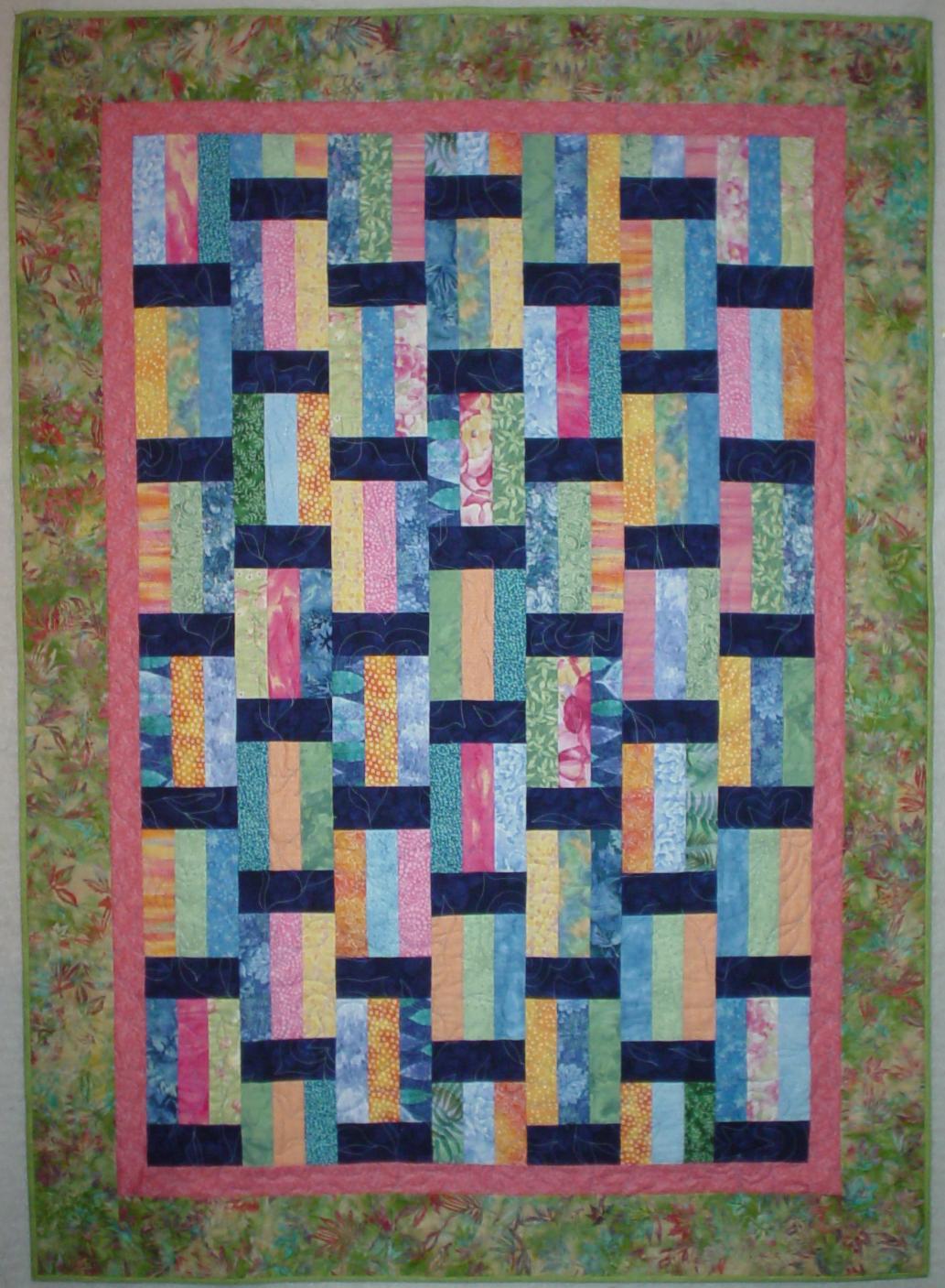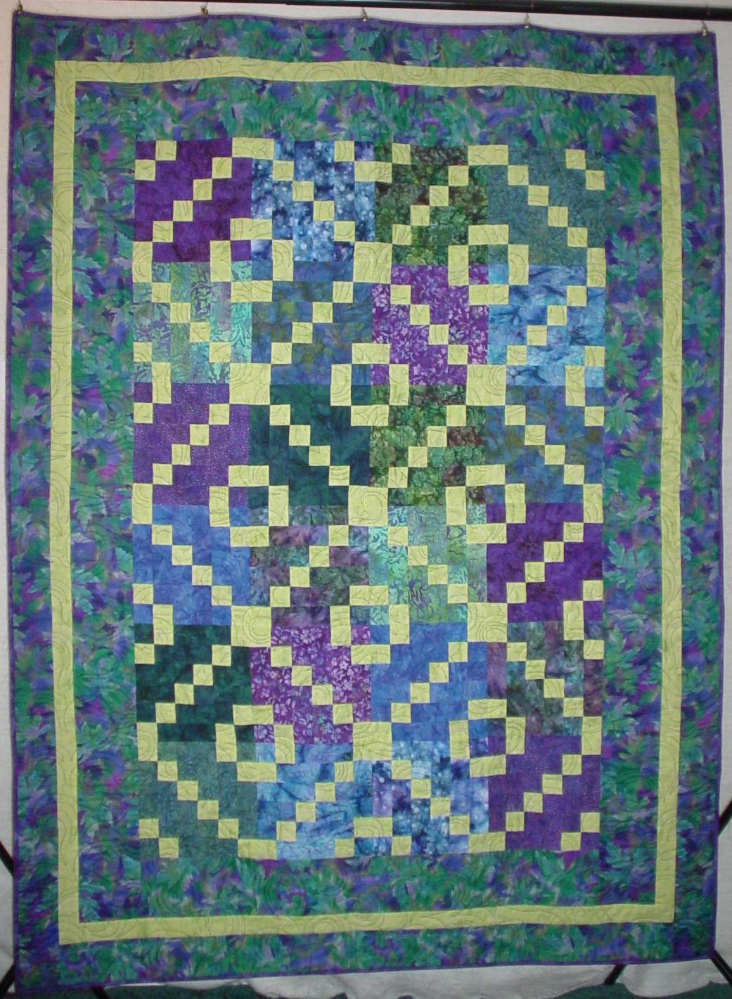 This bright colored quilt features batik fabrics "hourglass" blocks in two sizes. It serves as a comfort quilt for a dear friend.