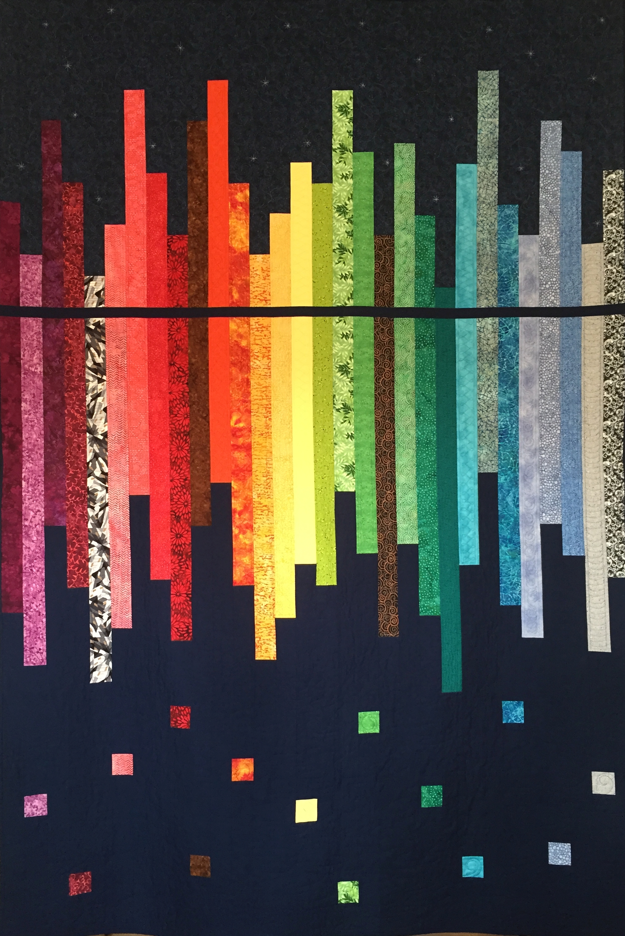 A comfort quilt with a variety of bright colors set on a dark blue background. Custom quilted with individual designs in each bar.