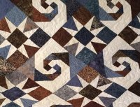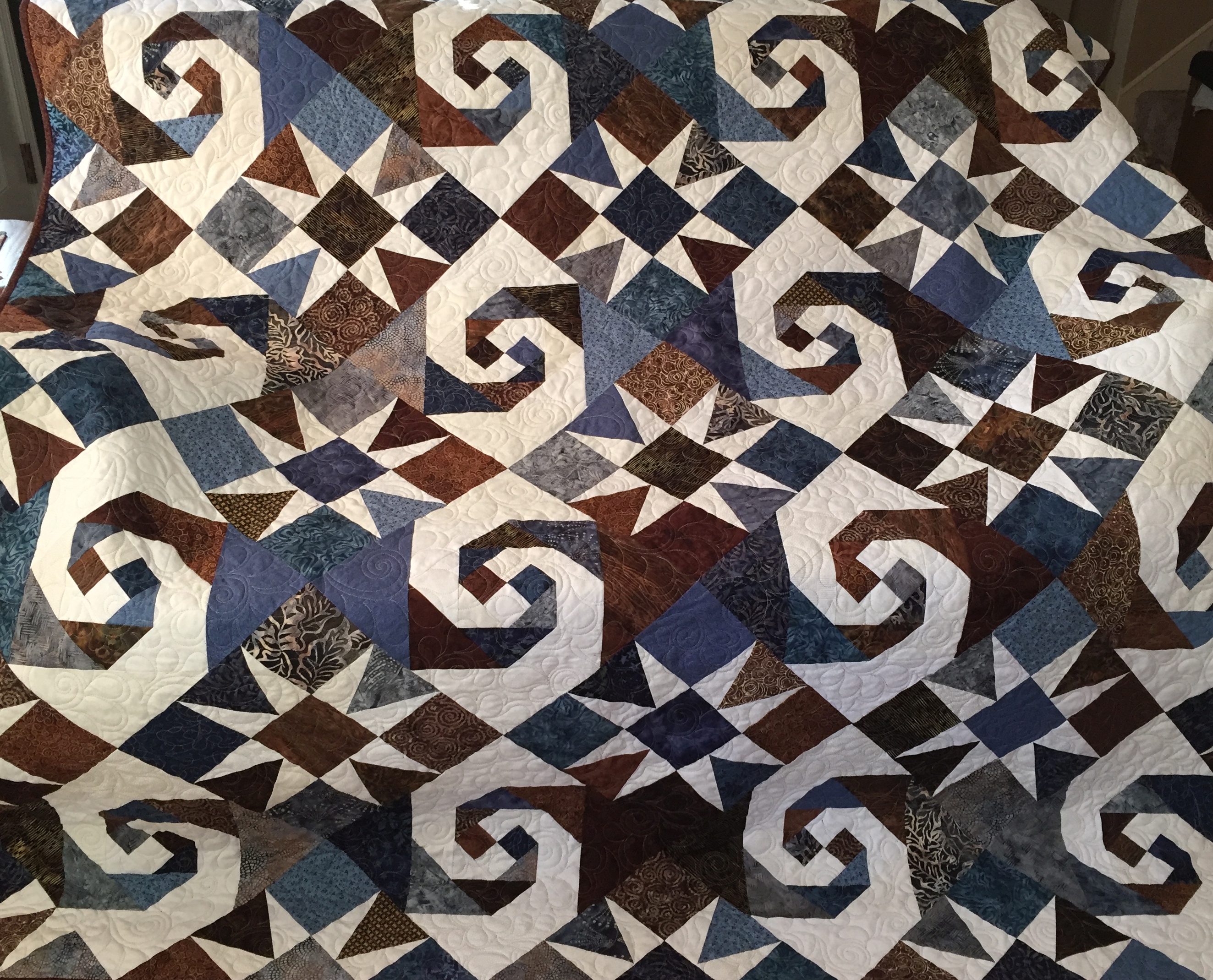 A rich mix of blues and browns set on white. Alternating Snails Trails and Star blocks give this quilt lots of movement. Quilted edge-to-edge with a feathered swirl.