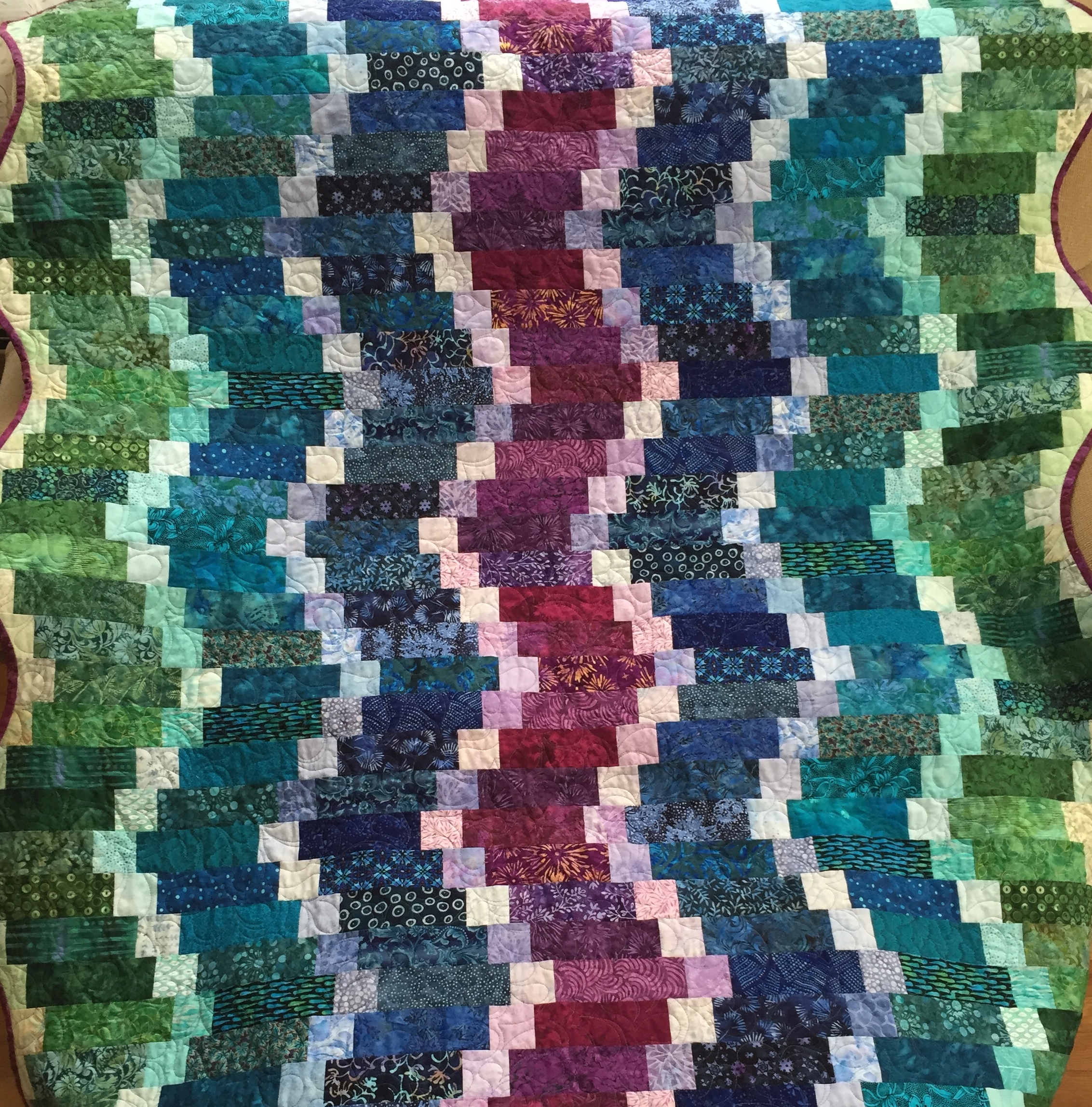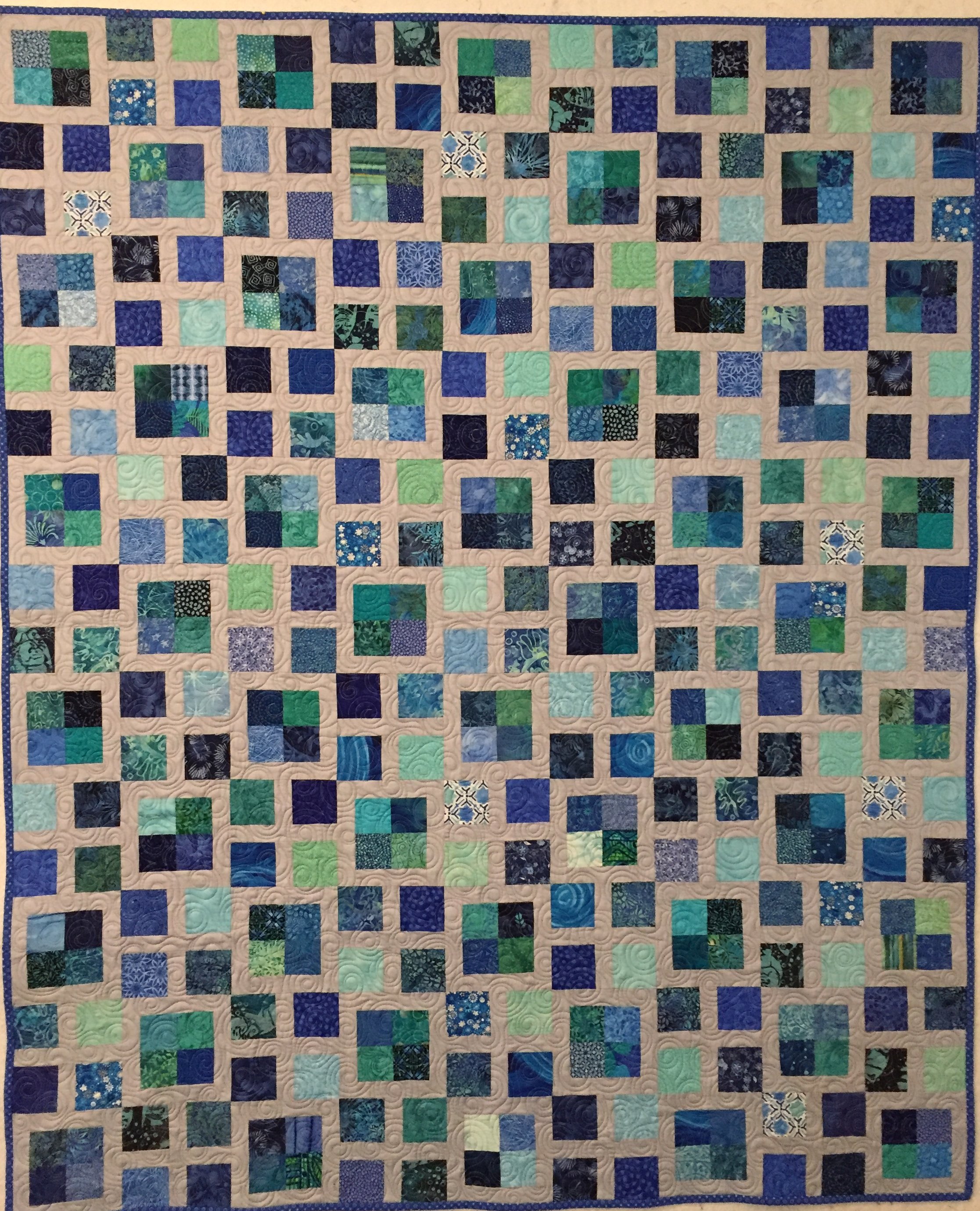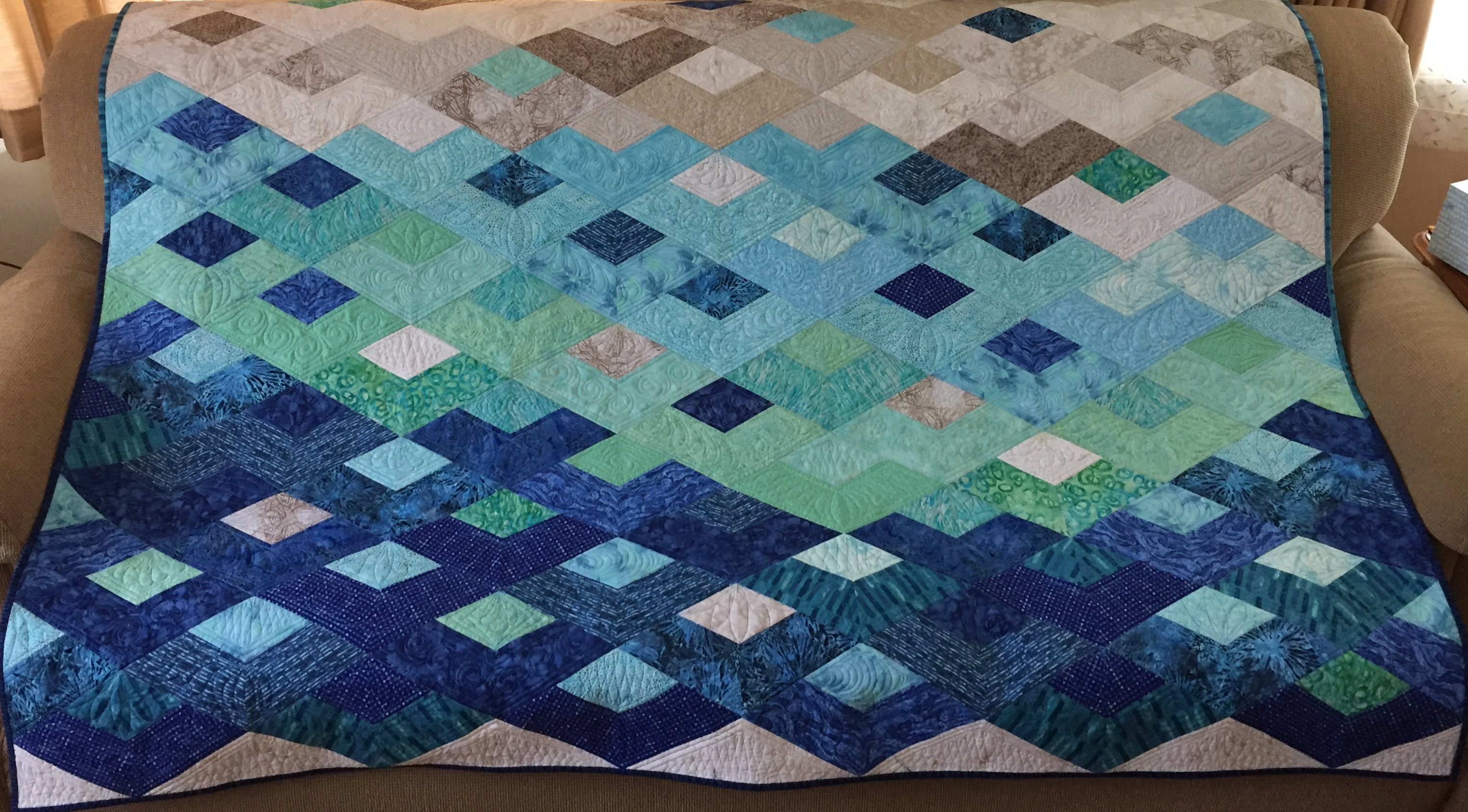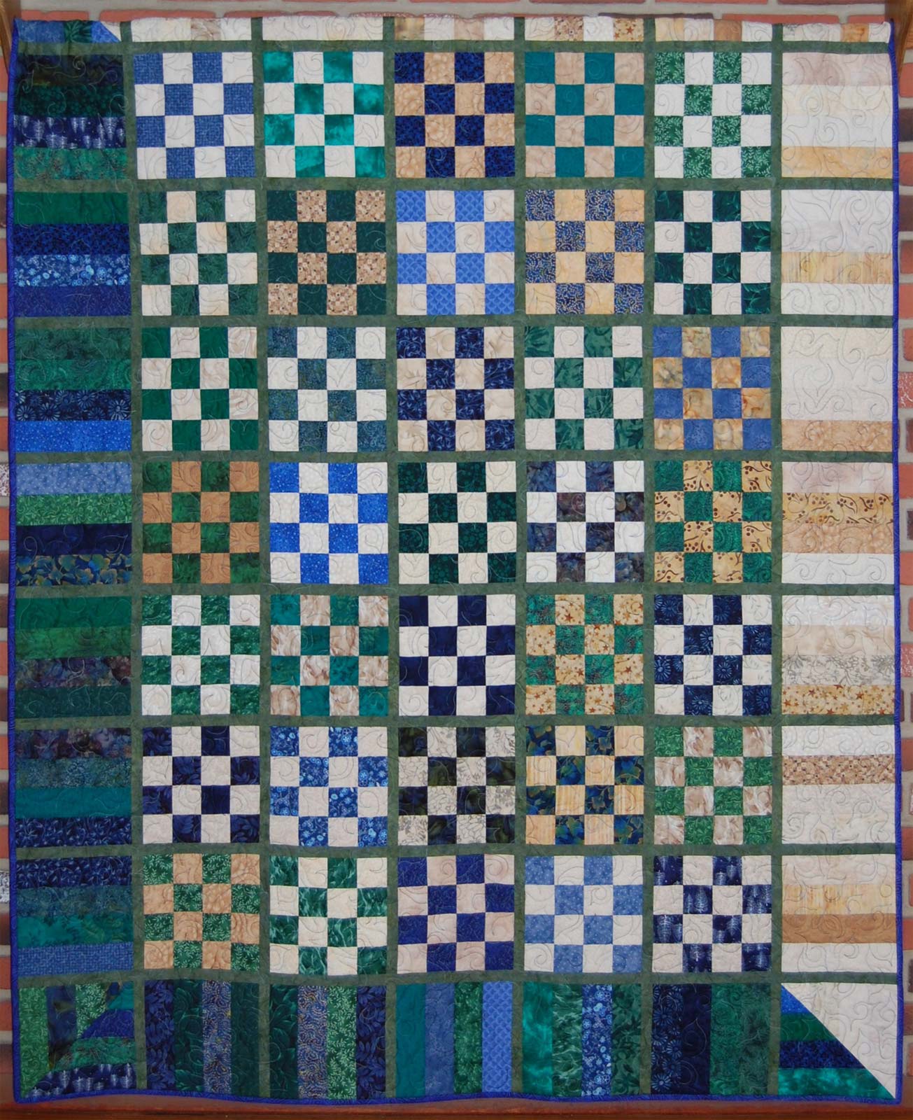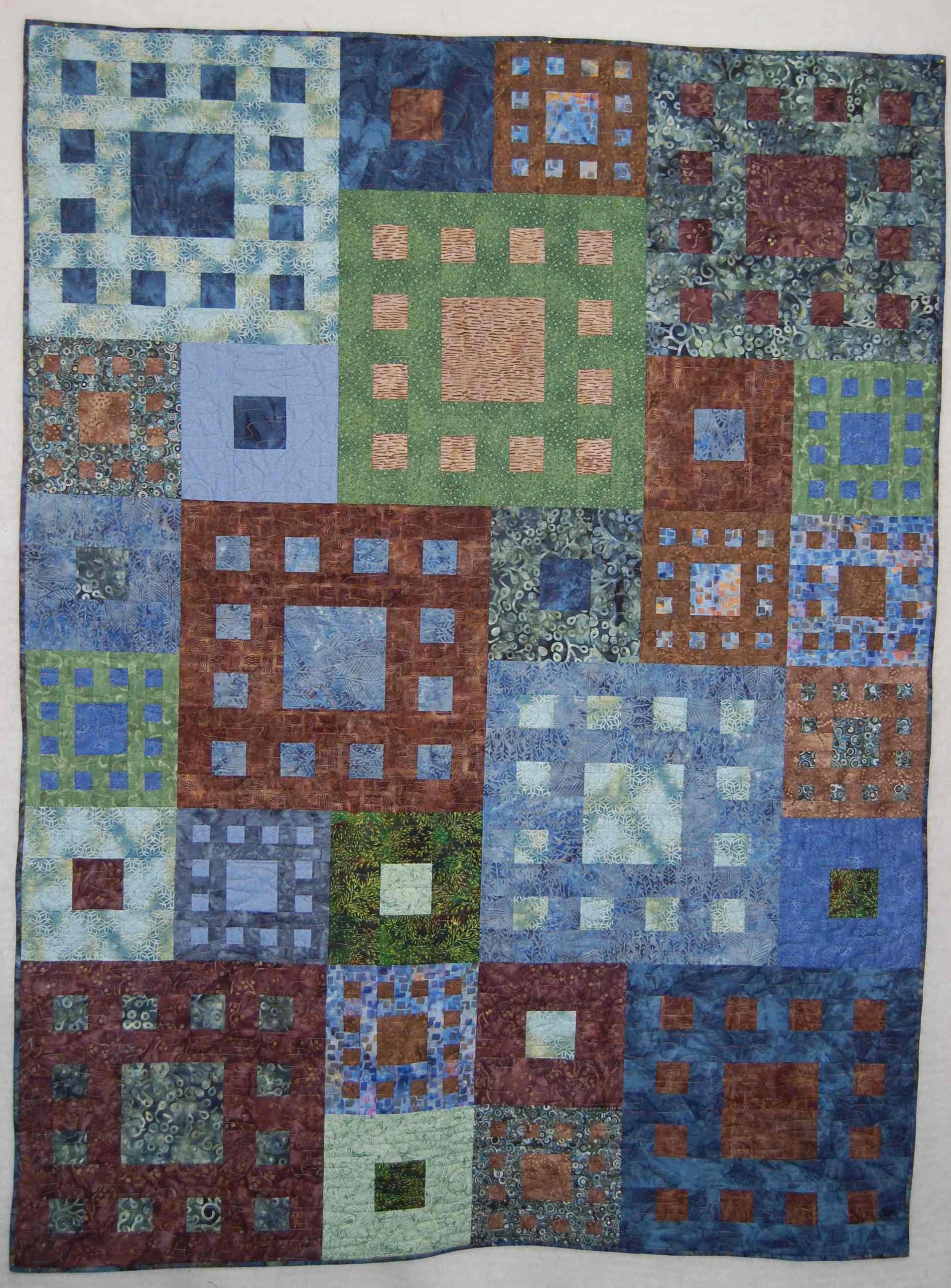 I fell in love with this combination of browns, greens and blues that had collected in my stash. Machine quilted in a ripple-water pattern to emphasize the "earthy" feel, this quilt is for me!