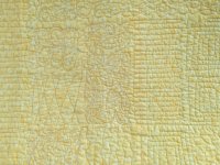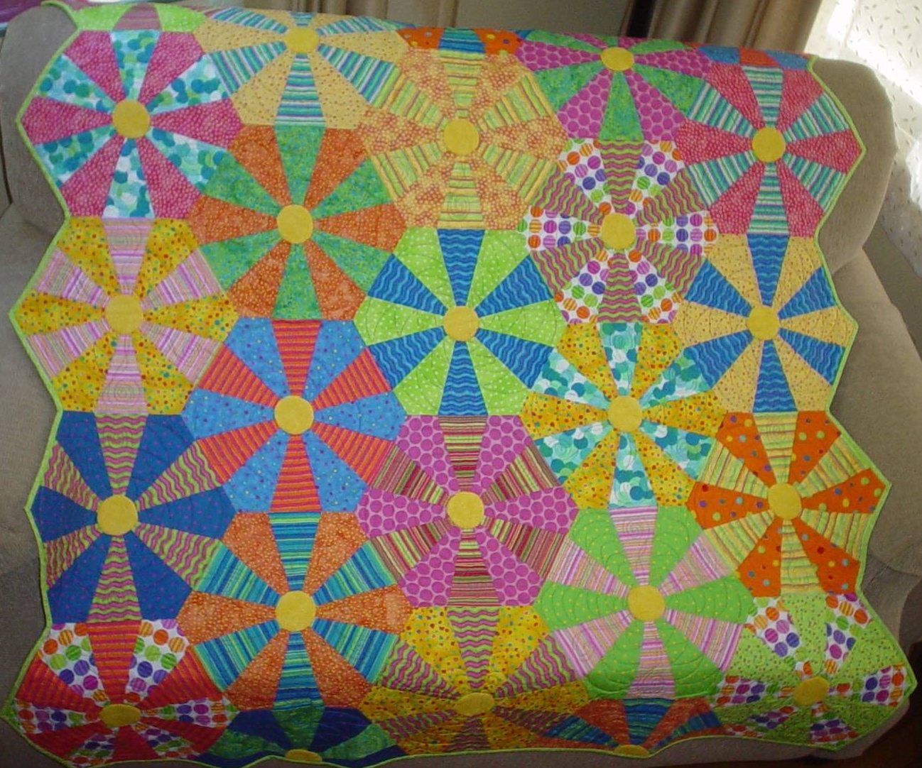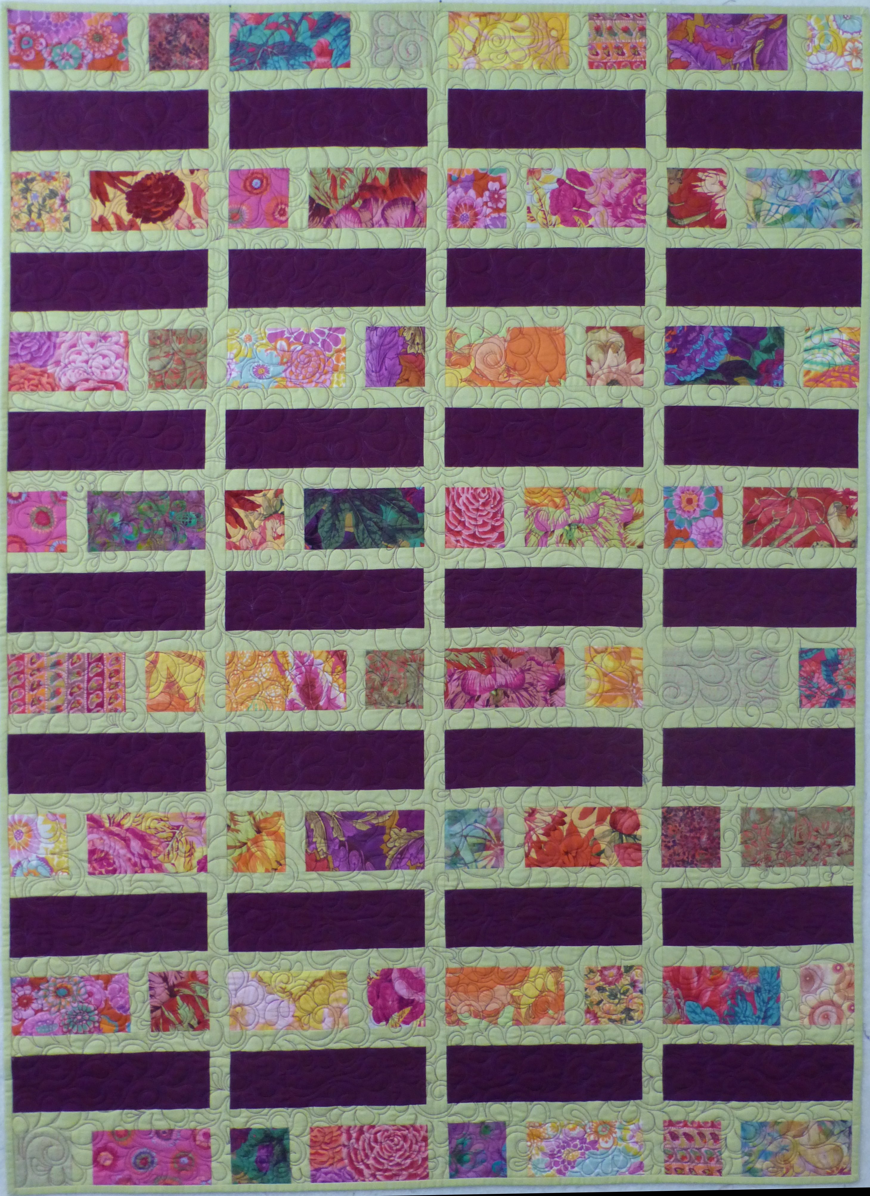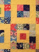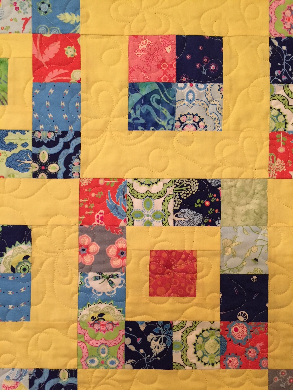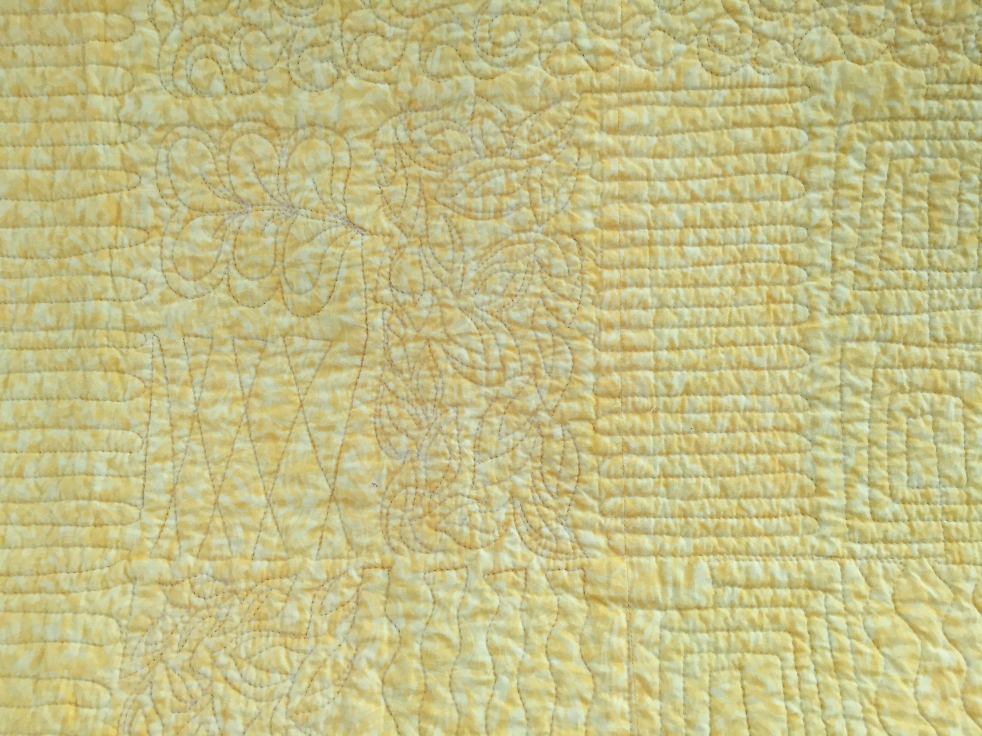 A scrappy quilt set up bright yellow to lift the spirits. Quilted edge-to-edge with flowers and loop-de-loop.
