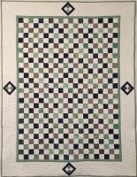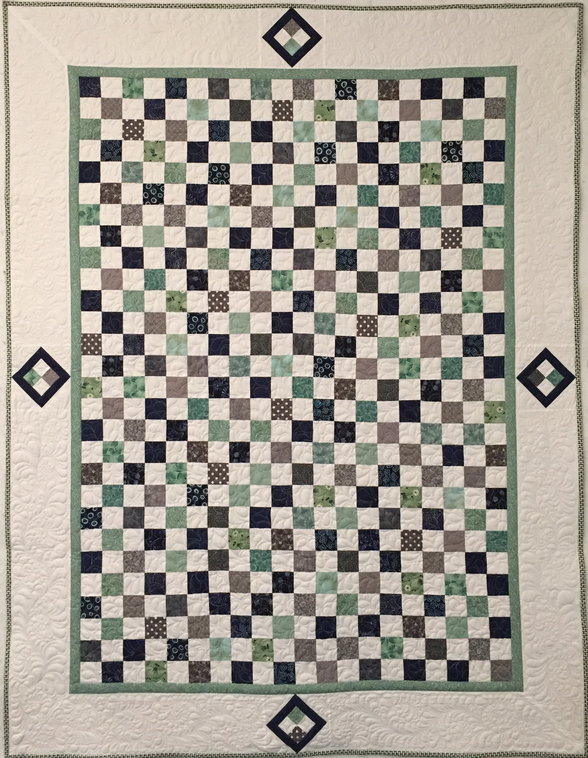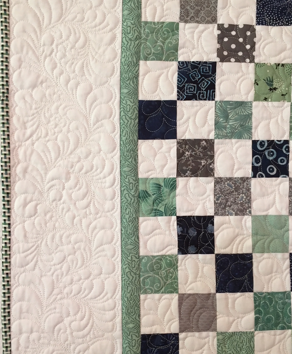 A modern interpretation of a traditional quilt. The color scheme of green, gray and navy are based on the colors used in the library's new logo. Custom quilted with detailed curving feathers in the border and an overall feather-like design in the center.