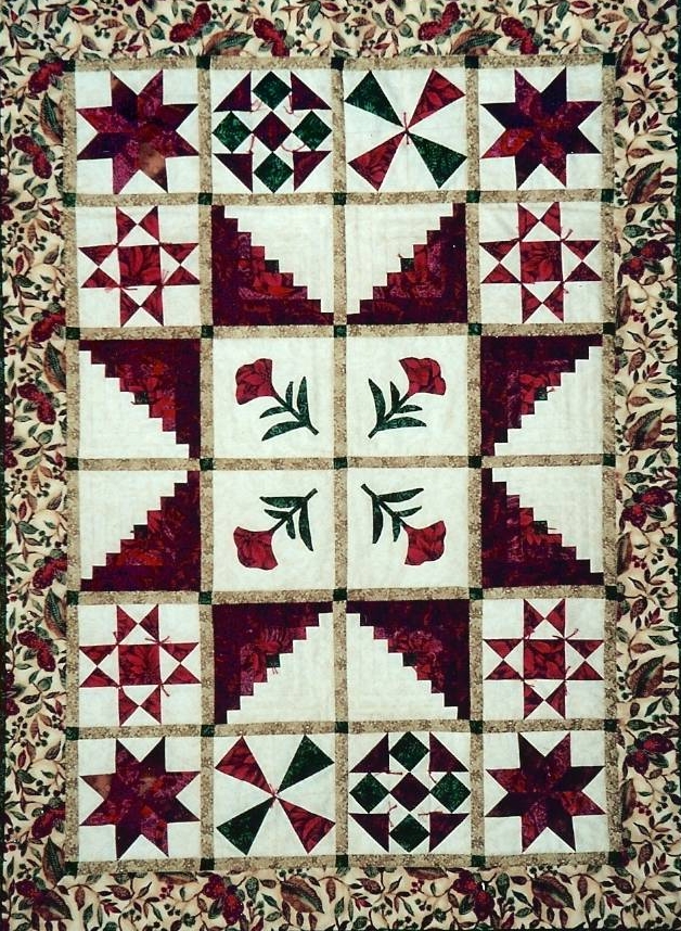 Donated to the local Education Foundation auction, this quilt features a log cabin star surrounded by a variety of pieced blocks all in reds, greens and golds.