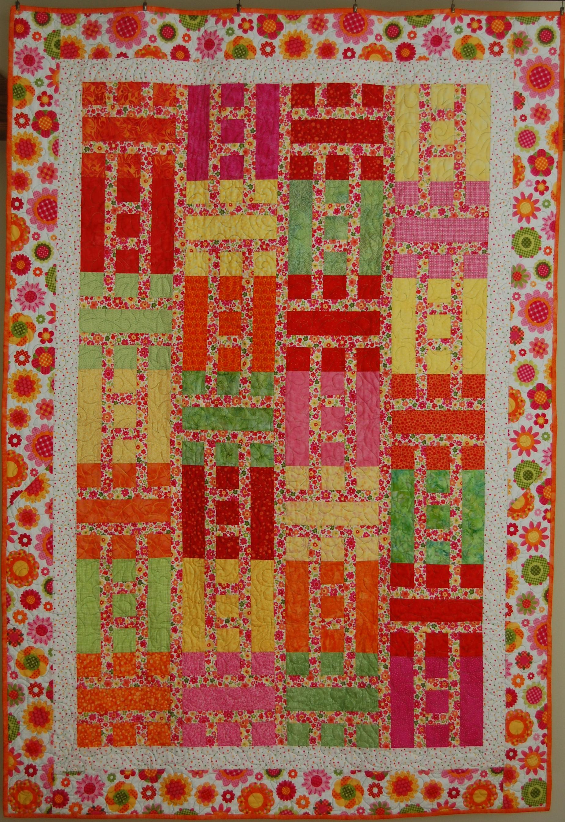 From the book "Cozy Modern Quilts" by Kim Schaefer. Just loved the bright floral fabrics and matched them with others in my stash. Quilted with a daisy pantograph."