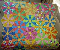 I participated in a Shop Hop in which each step of the directions was given at each participating shop. Using some fat quarters purchased on the Hop and adding fabrics from my stash resulted in this bright and fun quilt.