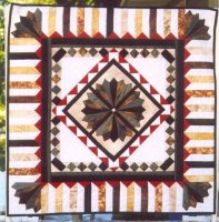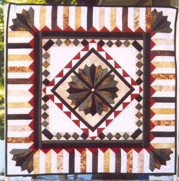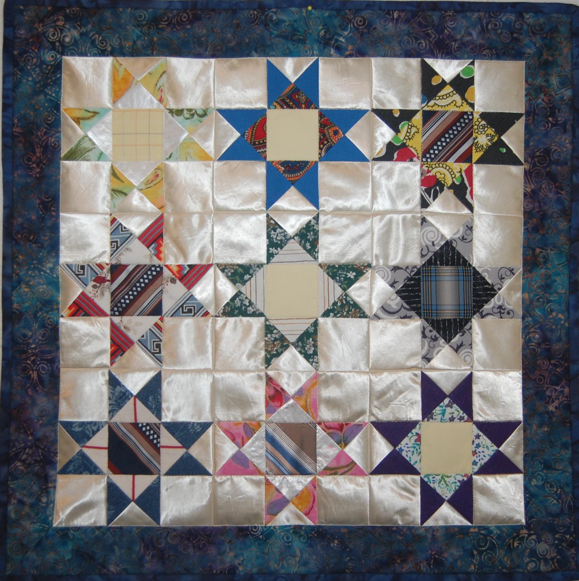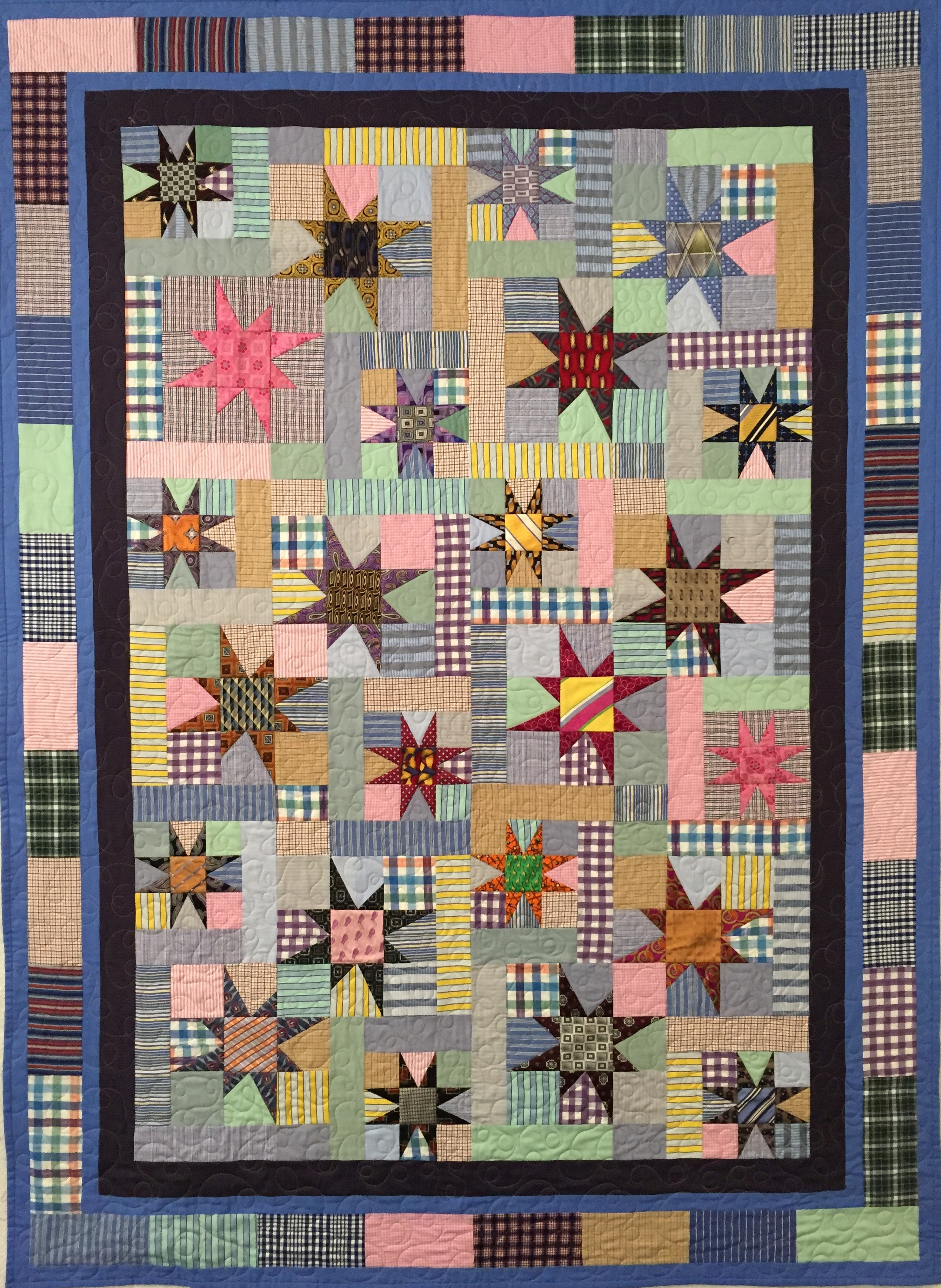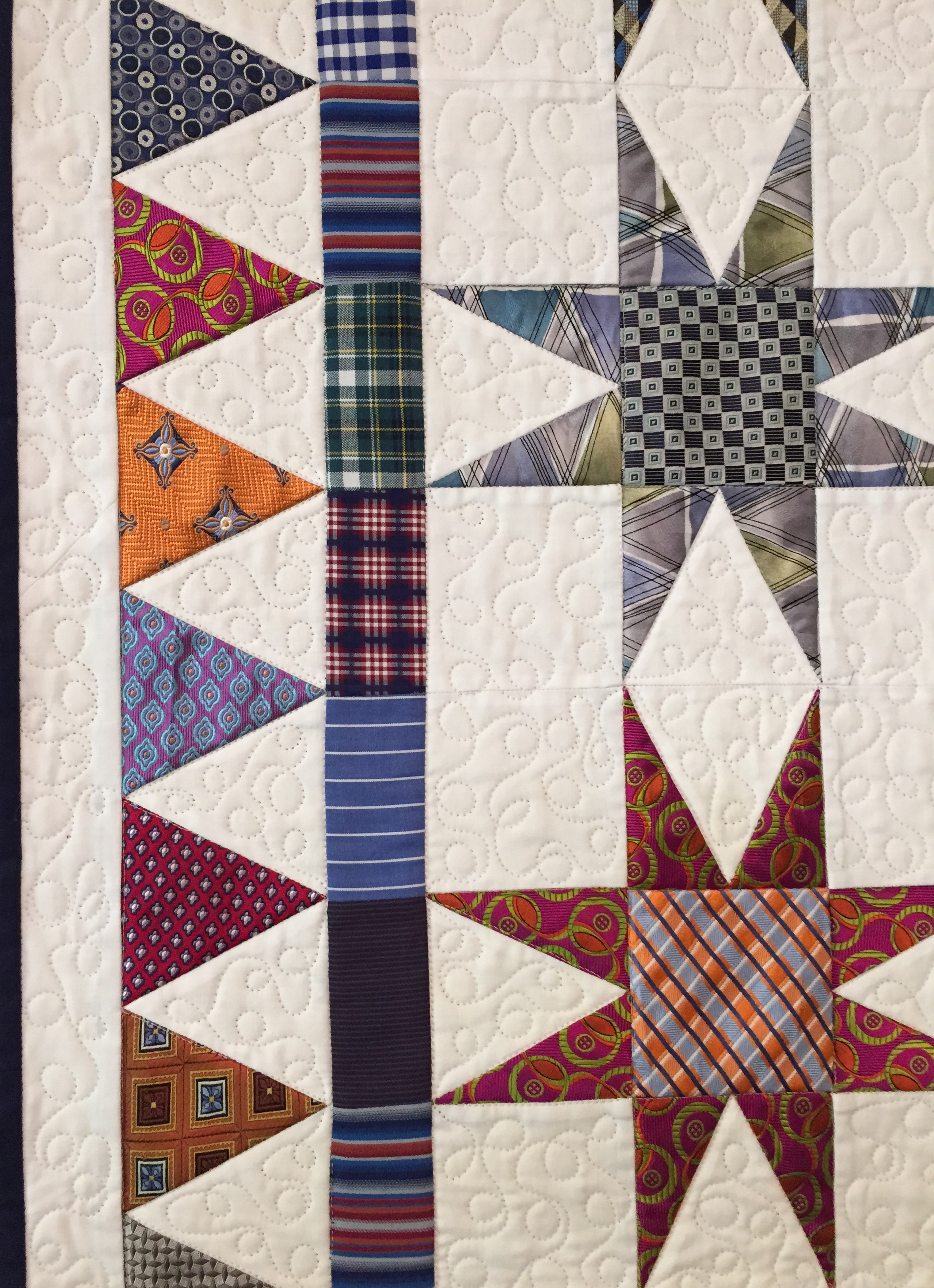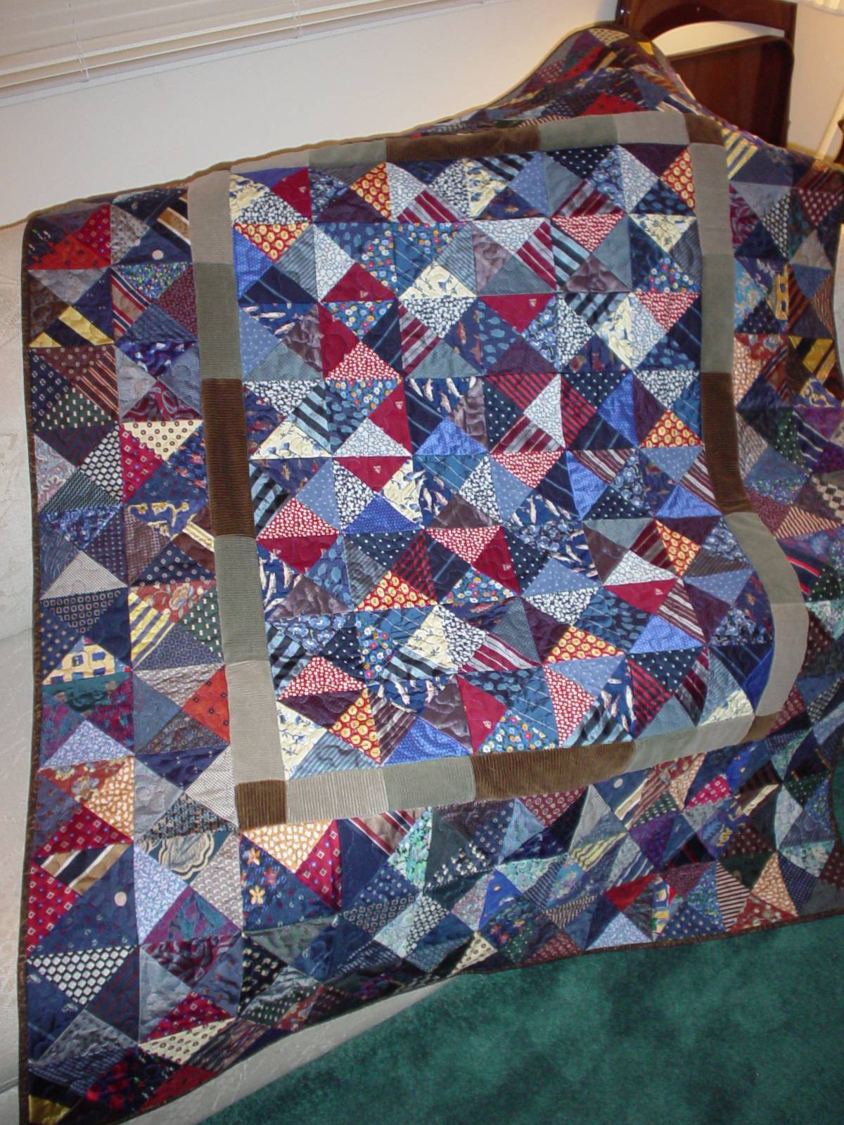 Made in memory of a beloved father, this quilt was made from his silk neckties. The border surrounding the center medallion features fabric from corduroy pants. Machine quilted in an all-over meander.