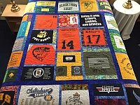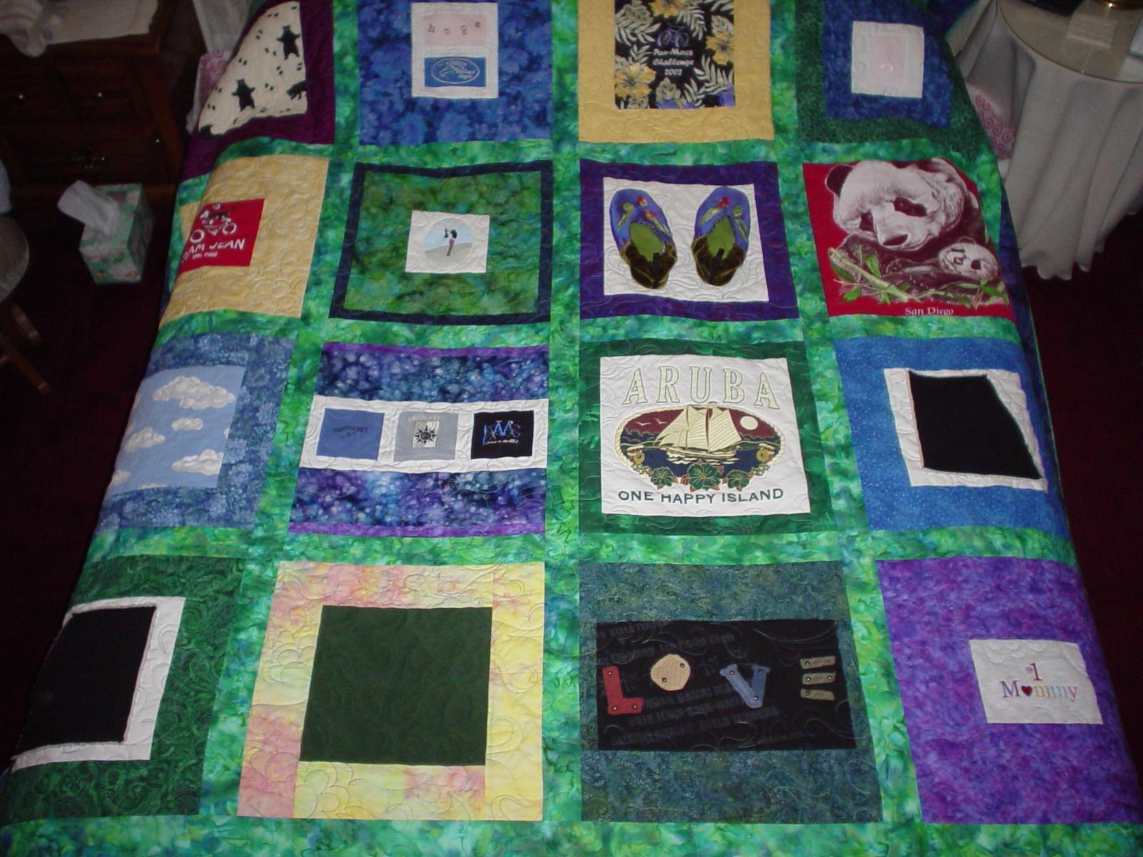 A memorial quilt which features t-shirts, sweatshirts, pajamas, robes, vests, and hat logos. Appliquéd to the quilt top are a pair of silk slippers and the pockets from an often-worn vest.