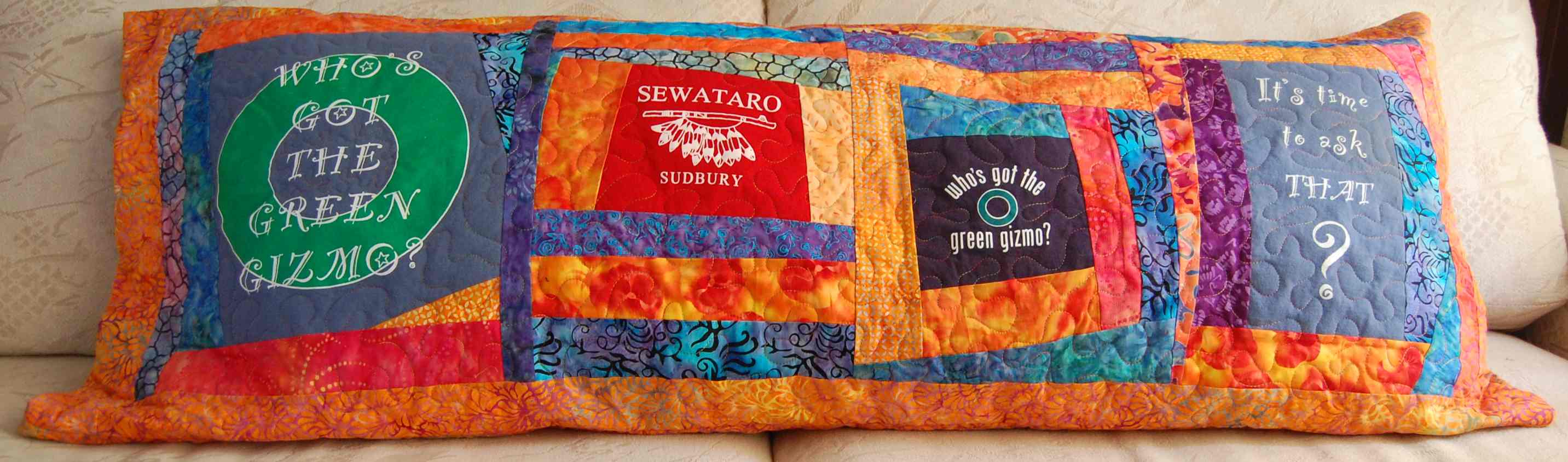 A mix of small, medium and large logos are cut with irregular sides and squared up with "crazy quilt piecing." This quilt uses bright batiks.