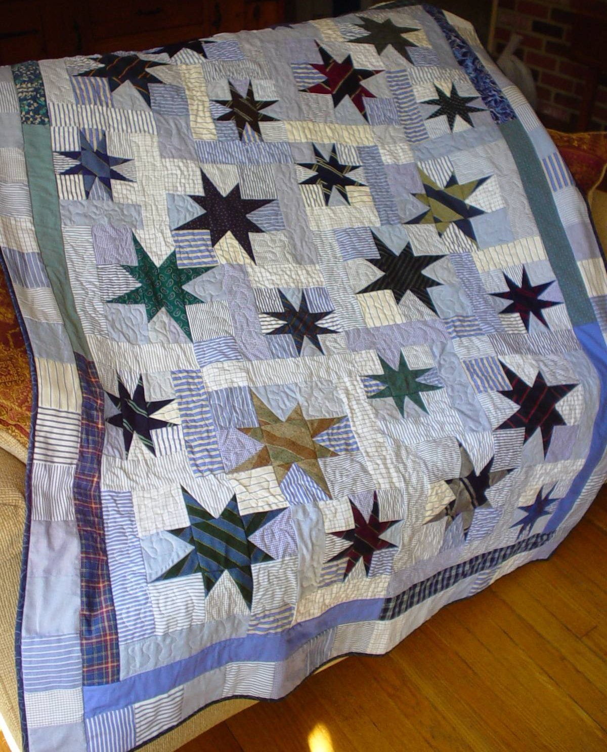 This pair of quilts are made from shirts and ties from a dear husband and son. A comfort for those who miss a loved one.