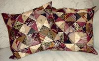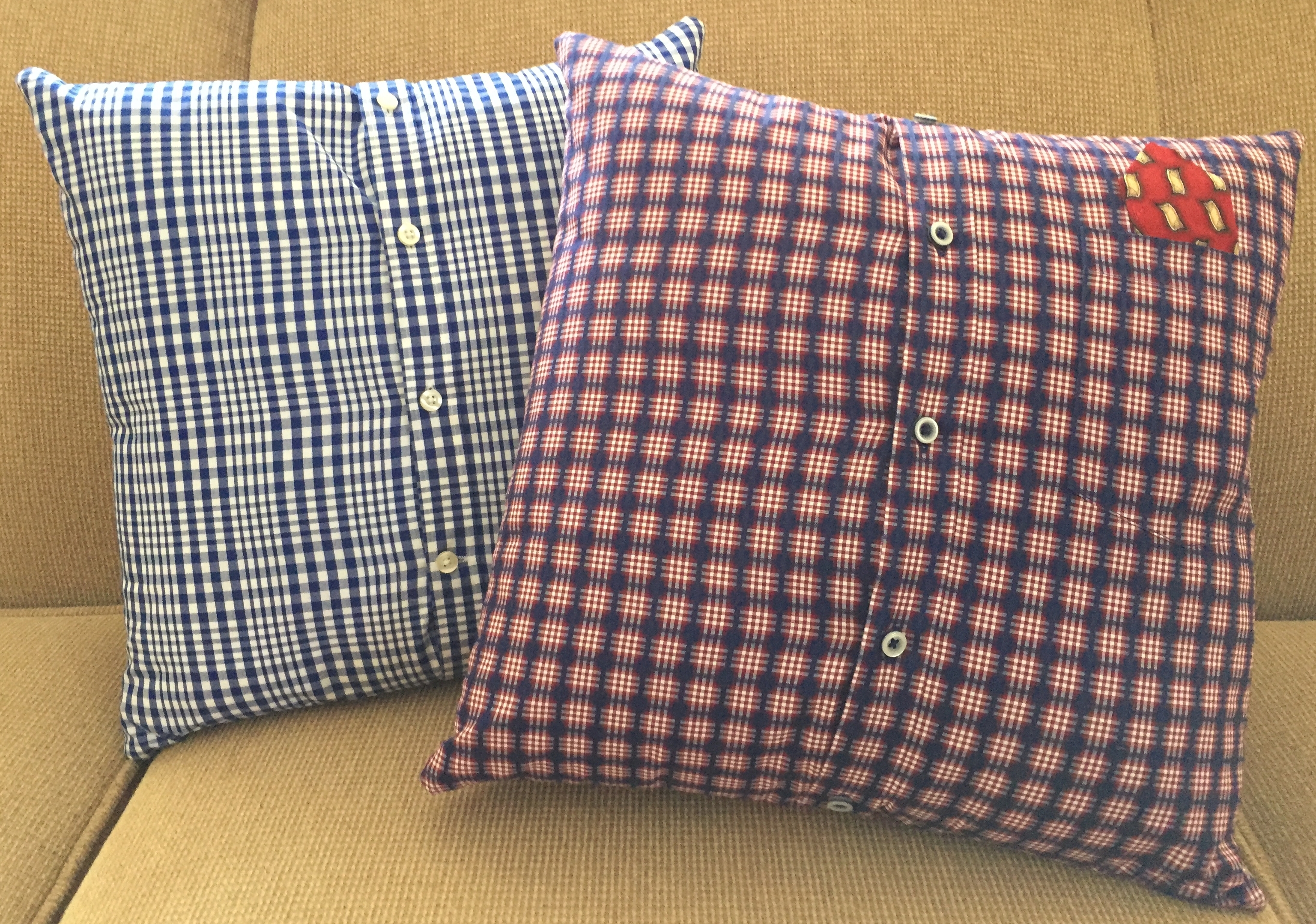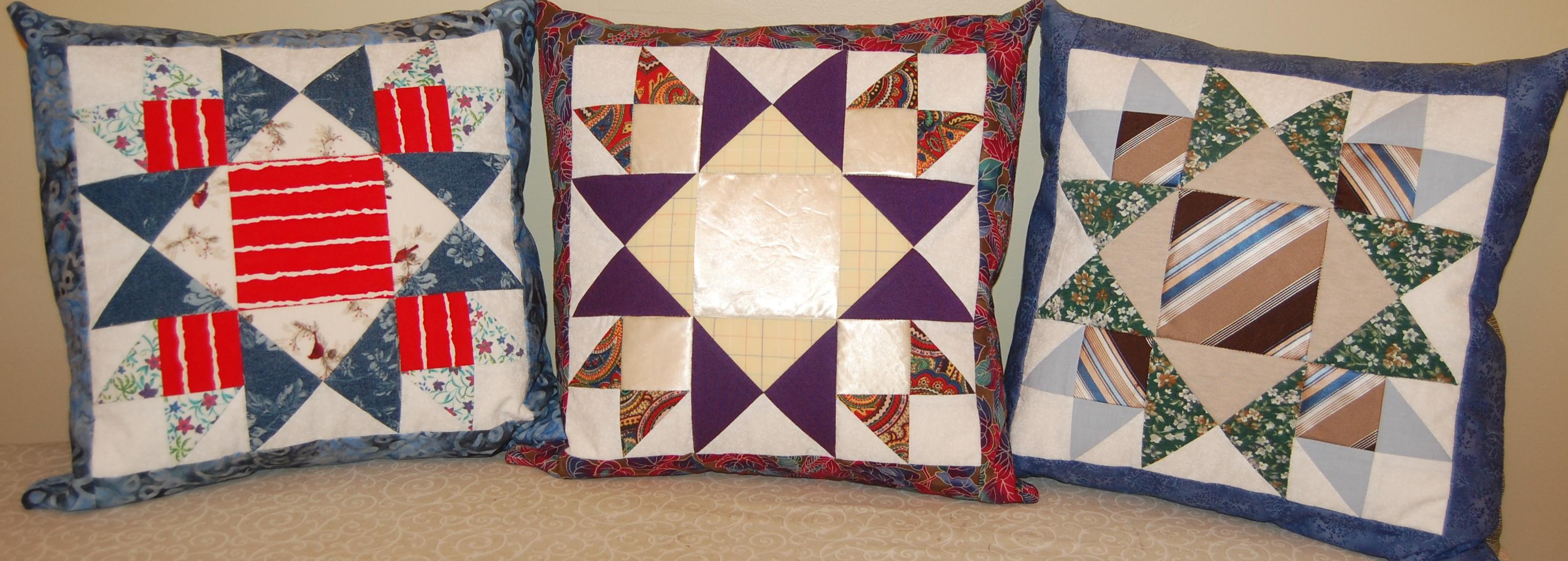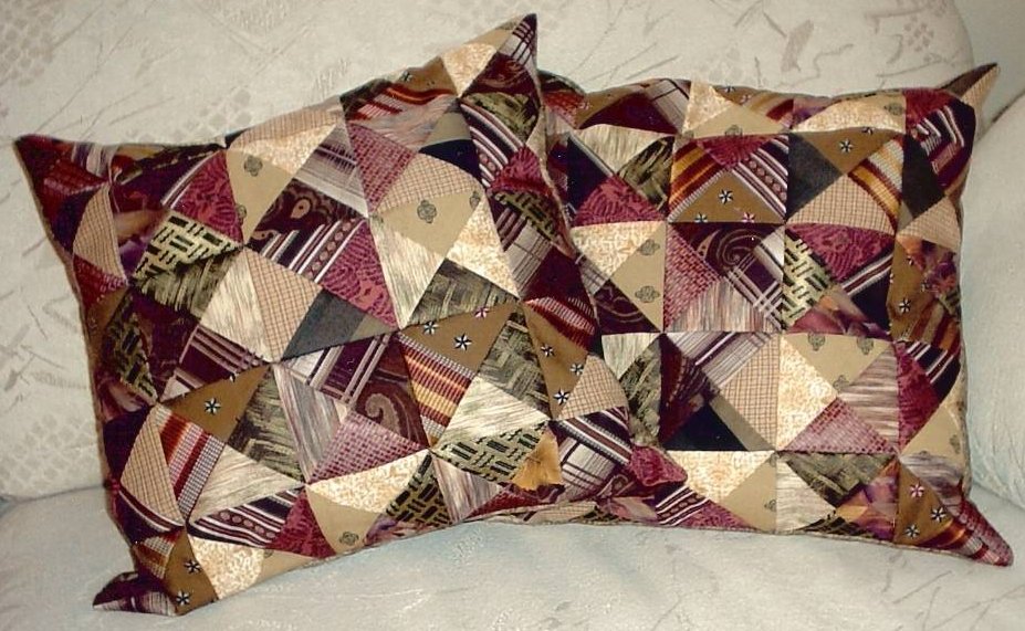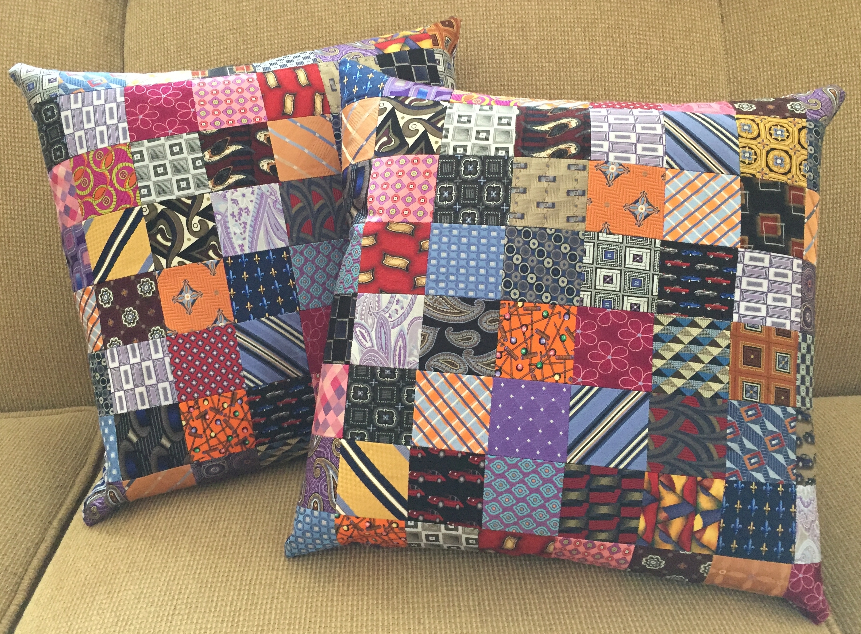 Using the extra tie and shirt fabrics, these pillows match the previous quilts. The pillow backs are made from shirt fronts.