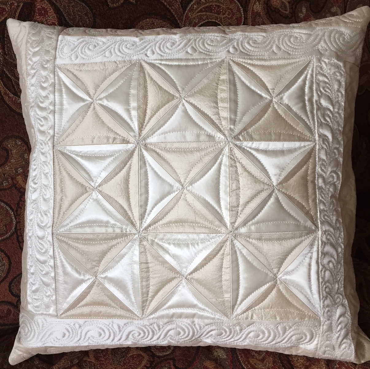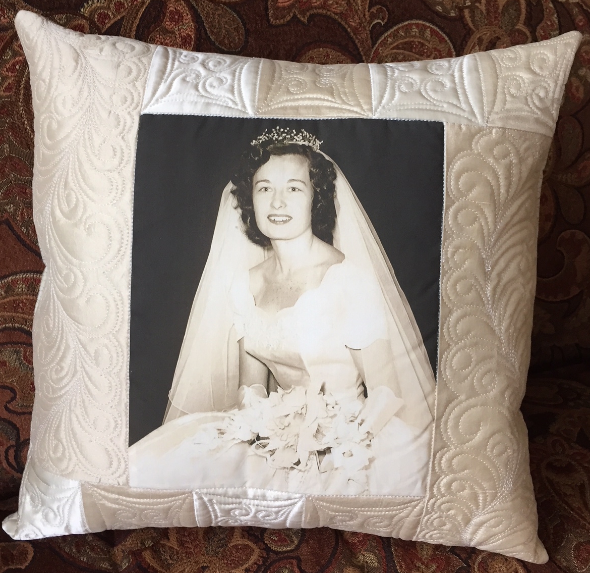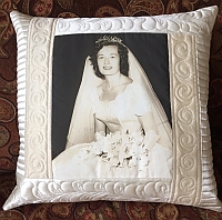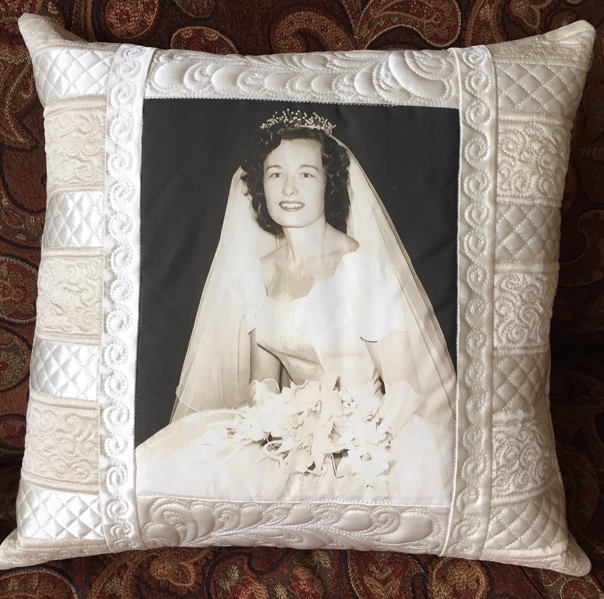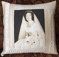 A tribute to my mother-in-law, these pillows were made for each of her children and one for her using her wedding dress. The dress was Italian silk with a satin lining.